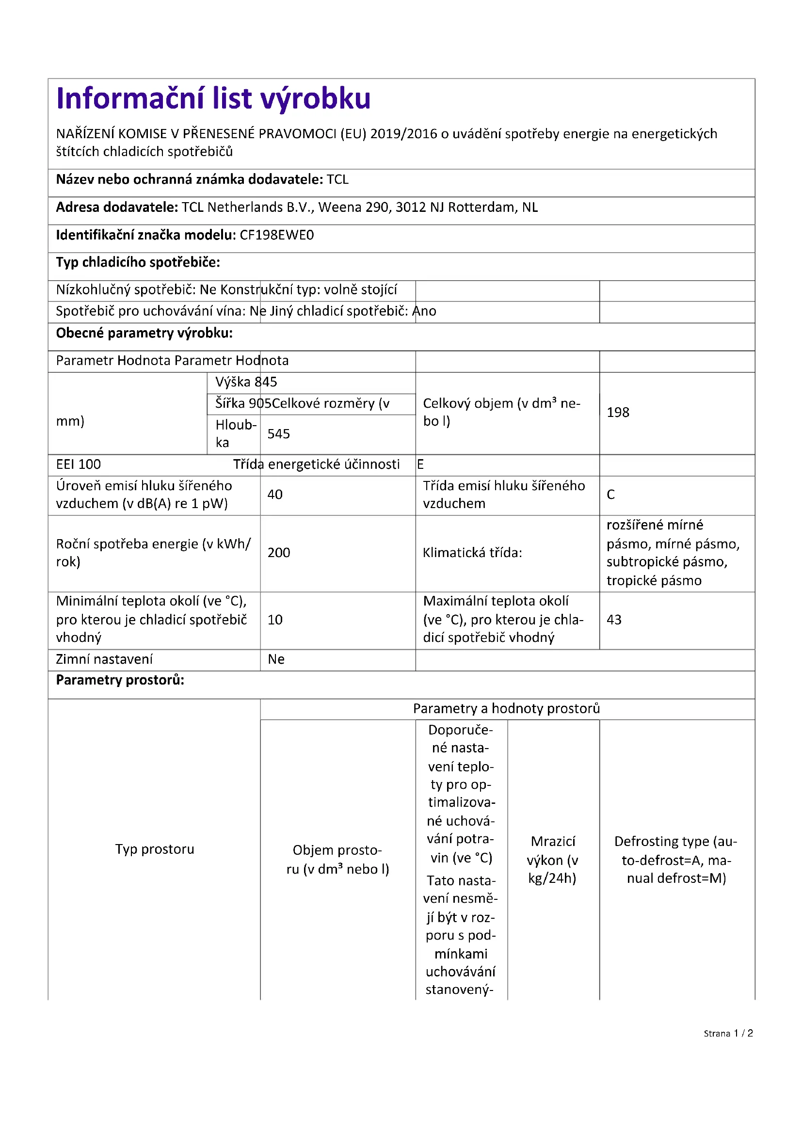 Pro prostory označené čtyřmi hvězdičkami Funkce rychlého zmrazení Ano Parametry zdroje světla: Typ zdroje světla - Třída energetické účinnosti - Minimální doba trvání záruky nabízená výrobcem: 24 měsíců Další informace: Odkaz na internetové stránky výrobce, kde lze nalézt informace podle bodu 4 písm. a) přílohy nařízení Komise (EU) 2019/2019: www.tcl.com Strana 2 / 2Produktdatablad KOMMISSIONENS DELEGEREDE FORORDNING (EU) 2019/2016 for så vidt angår energimærkning af køle/ fryseapparater Leverandørens navn eller varemærke TCL Leverandørens adresse: TCL Netherlands B.V., Weena 290, 3012 NJ Rotterdam, NL Modelidentifikation: CF198EWE0 Type køle/fryseapparat: Støjsvagt apparat: Nej Type design: fritstående Vinkøleskab: Nej Andre køle/fryseapparater: Ja Generelle produktparametre: Parametre Værdi Parametre Værdi Højde 845 Bred-