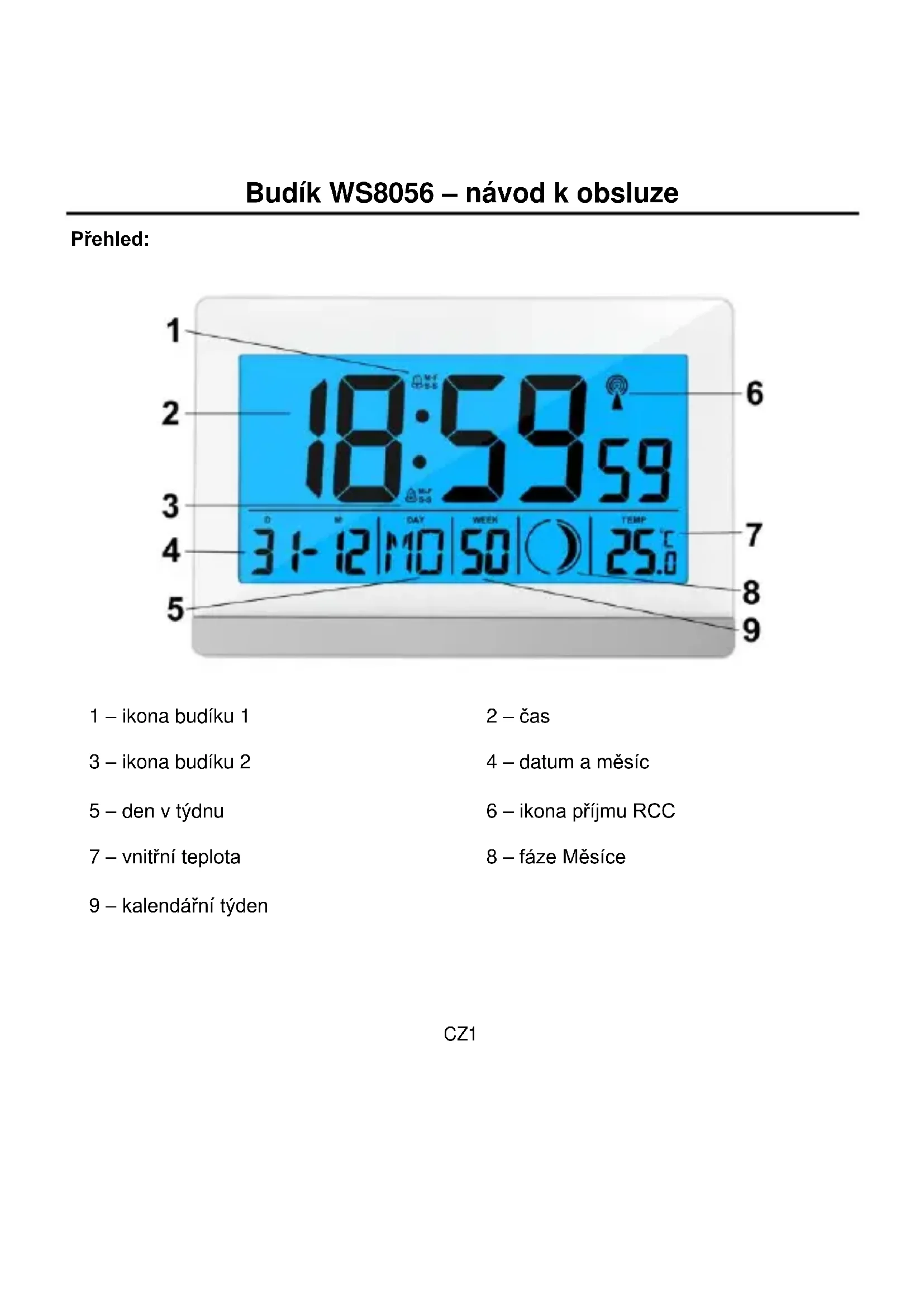 Stisknutím tlačítka „SET“ potvrďte nastavení. Začne blikat zobrazení roku 2015. Stisknutím tlačítka „UP“ nebo „DOWN“ nastavte správný rok. Stisknutím tlačítka „SET“ potvrďte nastavení. Začne blikat zobrazení formátu data. Stisknutím tlačítka „UP“ nebo „DOWN“ nastavte správný formát data. Stisknutím tlačítka „SET“ potvrďte nastavení. Začne blikat zobrazení měsíce. Stisknutím tlačítka „UP“ nebo „DOWN“ nastavte správný měsíc. Stisknutím tlačítka „SET“ potvrďte nastavení. Začne blikat zobrazení data. Stisknutím tlačítka „UP“ nebo „DOWN“ nastavte správné datum. Stisknutím tlačítka „SET“ potvrďte nastavení. Začne blikat zobrazení hodin.CZ7 Stisknutím tlačítka „UP“ nebo „DOWN“ nastavte správnou hodinu. Stisknutím tlačítka „SET“ potvrďte nastavení. Začne blikat zobrazení minut. Stisknutím tlačítka „UP“ nebo „DOWN“ nastavte správnou minutu. Stisknutím tlačítka „SET“ potvrďte nastavení. Začne blikat zobrazení 12- a 24hodinového formátu. Stisknutím tlačítka „UP“ nebo „DOWN“ nastavte 12- nebo 24hodinový formát. Stisknutím tlačítka „SET“ potvrďte nastavení. Začne blikat zobrazení časového pásma. Stisknutím tlačítka „UP“ nebo „DOWN“ nastavte správné časové pásmo. Stisknutím tlačítka „SET“ potvrďte nastavení. Začne blikat zapnutí „ON“ funkce DCF. Stisknutím tlačítka „UP“ nebo „DOWN“ aktivujte nebo deaktivujte funkci DCF. Stisknutím tlačítka „SET“ potvrďte nastavení, ukončete proces nastavování a přejděte do režimu hodin. Poznámky: Po 30 sekundách bez stisknutí jakéhokoli tlačítka se budík automaticky přepne zpět do režimu normálního zobrazení. V režimu normálního zobrazení času přejděte stisknutím tlačítka „DOWN“ do režimu nastavení časového pásma. Stisknutím tlačítka „UP“ nebo „DOWN“ a jeho podržením nastavování hodnotCZ8 zrychlíte. Nastavení budíku A1 a A2: Chcete-li zobrazit časy nastavení buzení v režimu hodin, stiskněte opakovaně tlačítko „ALARM“. Na displeji se zobrazí ikona A1, A2, AP. Během zobrazení budíku A1 nebo A2 stiskněte tlačítko „ALARM“ a podržte jej stisknuté po dobu 2 sekund, dokud nezačne blikat zobrazení hodin v času budíku. Stisknutím tlačítka „UP“ nebo „DOWN“ nastavte požadovanou hodinu. Stisknutím tlačítka „ALARM“ potvrďte nastavení. Začne blikat displej nastavení minut. Stisknutím tlačítka „UP“ nebo „DOWN“ nastavte požadovanou minutu. Stisknutím tlačítka „ALARM“ potvrďte nastavení a ukončete proces nastavování. Poznámky: Po 30 sekundách bez stisknutí jakéhokoli tlačítka se budík automaticky přepne z režimu nastavení budíku do režimu normálního zobrazení. Stisknutím tlačítka „UP“ nebo „DOWN“ a jeho podržením nastavování hodnot zrychlíte.CZ9 Nastavení budíku AP: Budík AP je budík nastavený pro určité datum. Chcete-li v režimu hodin zobrazit časy nastavení budíku, stiskněte opakovaně tlačítko „ALARM“. Na displeji LCD se zobrazí ikona A1, A2, AP. Během zobrazení budíku AP stiskněte tlačítko „ALARM“ a podržte jej stisknuté po dobu 2 sekund, dokud nezačne blikat zobrazení roku v datu budíku. Stisknutím tlačítka „UP“ nebo „DOWN“ nastavte požadovanou hodinu. Stisknutím tlačítka „ALARM“ potvrďte nastavení. Začne blikat zobrazení měsíce času budíku. Stisknutím tlačítka „UP“ nebo „DOWN“ nastavte požadovaný měsíc. Stisknutím tlačítka „ALARM“ potvrďte nastavení. Začne blikat zobrazení data času budíku. Stisknutím tlačítka „UP“ nebo „DOWN“ nastavte požadované datum. Stisknutím tlačítka „ALARM“ potvrďte nastavení. V nastavení času buzení začne blikat zobrazení hodin. Stisknutím tlačítka „UP“ nebo „DOWN“ nastavte požadovanou hodinu. Stisknutím tlačítka „ALARM“ potvrďte nastavení. Začne blikat displej nastavení minut. Stisknutím tlačítka „UP“ nebo „DOWN“CZ10 nastavte požadovanou minutu. Stisknutím tlačítka „ALARM“ potvrďte nastavení a ukončete proces nastavování. Poznámky: Po 30 sekundách bez stisknutí jakéhokoli tlačítka se budík automaticky přepne z režimu nastavení budíku do režimu normálního zobrazení. Stisknutím tlačítka „UP“ nebo „DOWN“ a jeho podržením nastavování hodnot zrychlíte. Aktivace/deaktivace budíku A1, A2 a AP: Stisknutím tlačítka „ALARM“ vyberte mezi možnostmi A1, A2 nebo AP. Opakovaným stisknutím tlačítka „SET“ nastavte konkrétní typ budíku. Budík A1/A2 je aktivován v případě, že se zobrazuje odpovídající ikona zvonku budíku 1 nebo 2 spolu s ikonami M-F, S-S, M-F a S-S. Budík je deaktivován v případě, že se nezobrazuje žádná ikona. M-F = pondělí až pátek S-S = sobota a neděle M-F a S-S = pondělí až neděleCZ11 Budík AP je aktivován v případě, že se zobrazuje ikona zvonku budíku AP. Budík je deaktivován v případě, že se nezobrazuje žádná ikona. Poznámky: Nastane-li čas buzení, bude budík vyzvánět po dobu 2 minut, dokud jej nevypnete stisknutím jakéhokoli tlačítka. V tomto případě se budík automaticky zopakuje v příštím nastaveném čase. Zesilující zvuk budíku (stupňující se hlasitost, doba trvání: 2 minuty) během přehrávání signálu upozornění čtyřikrát změní hlasitost. Funkce opakovaného buzení: Funkci opakovaného buzení aktivujete během zvonění budíku stisknutím tlačítka „ “. Na displeji se zobrazí ikona „ “. Dojde tak k vypnutí zvonění budíku a jeho opětovnému zapnutí za 5 minut. Funkci opakovaného buzení lze zrušit stisknutím jakéhokoli tlačítka kromě tlačítka „ “.CZ12 Zobrazení teploty ve °C nebo °F: Teplota se zobrazuje v jednotkách °C nebo 