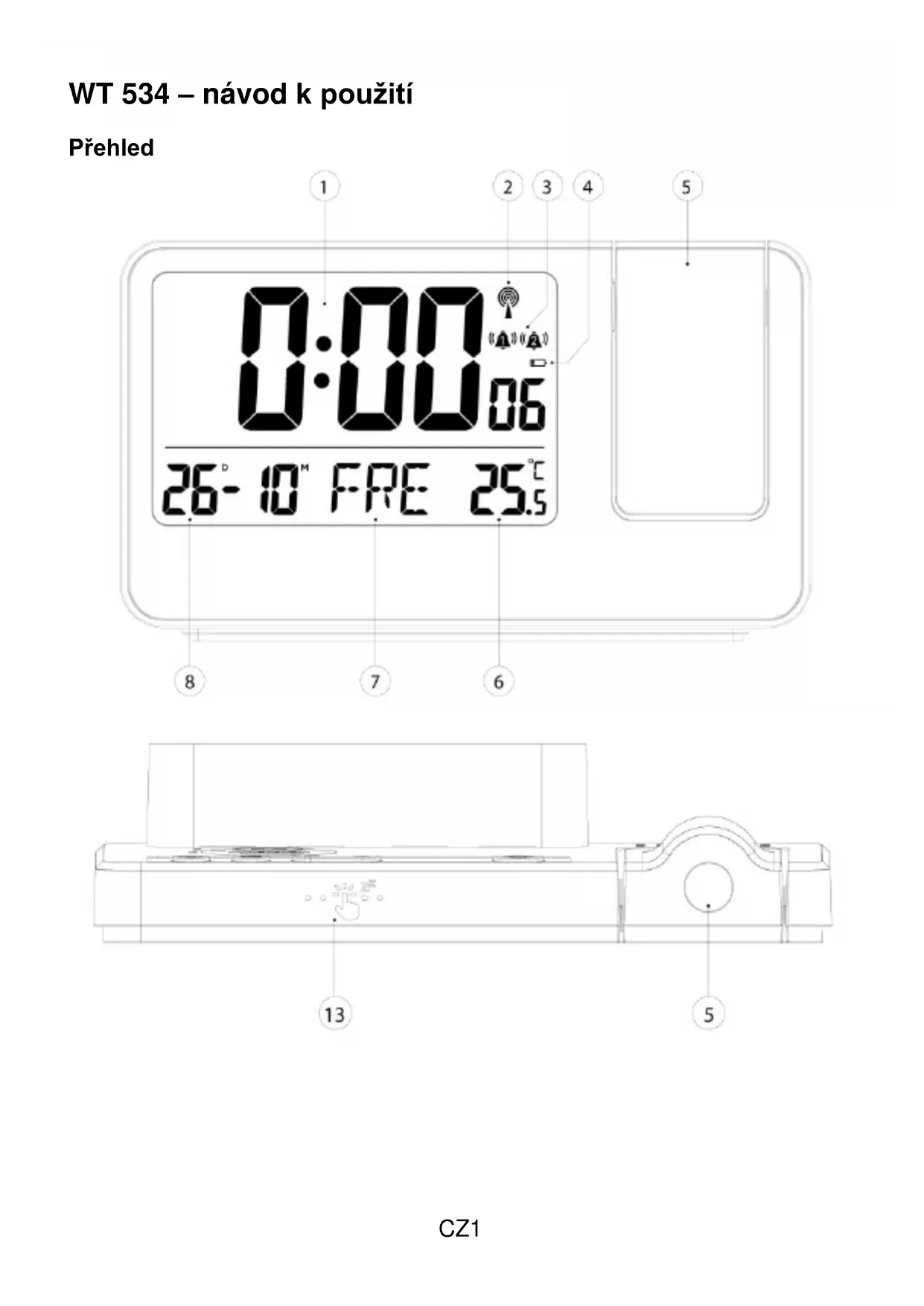 Aktivace/deaktivace každodenního buzení Stiskněte jednou tlačítko „ “ a na LCD displeji se zobrazí ikona , která znamená, že je aktivován pouze budík 1. Stiskněte znovu tlačítko „ “ a na LCD displeji se zobrazí ikona , která znamená, že je aktivován pouze budík 2. Stiskněte znovu tlačítko „ “ a na LCD displeji se zobrazí ikony a , což znamená, že jsou aktivovány oba budíky 1 a 2. Stiskněte znovu tlačítko „ “ a na LCD displeji nebudou zobrazeny žádné ikony, což znamená, že jsou oba budíky 1 a 2 deaktivovány. Nastavení každodenního buzení Jedním stisknutím tlačítka „ “ (ALARM) zobrazíte čas budíku 1. Dalším stisknutím tlačítka „ “ zobrazíte čas budíku 2. Dalším stisknutím tlačítka „ “ se vrátíte do režimu normálního zobrazení času. Když je zobrazen budík 1, stiskněte tlačítko „ “ a držte jej stisknuté po dobu 2 sekund. Začnou blikat hodiny času budíku 1. Stisknutím tlačítka „ “ nebo „ “ nastavte požadované hodiny. Stisknutím tlačítka „ “ potvrďte nastavení. Začnou blikat minuty časuCZ7 budíku 1. Stisknutím tlačítka „ “ nebo „ “ nastavte požadované minuty. Stisknutím tlačítka „ “ potvrdíte nastavení a ukončíte nastavování budíku 1. Když je zobrazen budík 2, stiskněte tlačítko „ “ a držte jej stisknuté po dobu 2 sekund. Začnou blikat hodiny času budíku 2. Stisknutím tlačítka „ “ nebo „ “ nastavte požadované hodiny. Stisknutím tlačítka „ “ potvrďte nastavení. Začnou blikat minuty času budíku 2. Stisknutím tlačítka „ “ nebo „ “ nastavte požadované minuty. Stisknutím tlačítka „ “ potvrdíte nastavení a ukončíte nastavování budíku 2. Poznámky: Pokud během 20 sekund nedojde ke stisknutí žádného tlačítka, hodiny automaticky ukončí nastavení a vrátí se do režimu normálního zobrazení času. Během nastavování hodnoty stiskněte a podržte tlačítko „ “ nebo „ “ pro rychlou úpravu nastavených hodnot. Budík bude vyzvánět po dobu 2 minut, dokud ho nevypnete stisknutím jakéhokoliv tlačítka. V tomto případě se upozornění po 24 hodinách automaticky opakuje. VYPNUTÍ zvuku budíku Když zazní tón budíku, stisknutím libovolného tlačítka kromě tlačítka „SNOOZE“ zvuk budíku zastavíte. Budík se spustí opět následující den.CZ8 Funkce opakovaného buzení Když zazní tón budíku, stisknutím tlačítka „SNOOZE“ ukončíte zvuk budíku a přejdete do režimu opakovaného buzení. Po uplynutí 8 minut doby opakovaného buzení signál budíku zazní znovu. Zobrazení teploty ve °C nebo °F Jedním stisknutím tlačítka „ “ přepnete mezi jednotkami teploty °C nebo °F. Podsvícení a funkce projekce Režim napájecího adaptéru Při používání napájecího adaptéru budou podsvícení a projekce vždy rozsvícené. Stisknutím tlačítka „ “ nastavíte jas podsvícení nebo ho vypnete. Pořadí nastavení jasu je: světlý střední tmavý OFF světlý střední tmavý…… Stisknutím tlačítka „ “ otočíte projekci o 180 stupňů. Poznámky: Je-li aktivována projekce, projekční vzdálenost je přibližně 2 metry. Nepřetržitá projekce je možná pouze při použití napájecího adaptéru. Při příjmu rádiových vln se podsvícení a projekce dočasně vypnou a po dokončení hledání signálu se jas obnoví.CZ9 Prohlášení o shodě Společnost Technotrade prohlašuje, že tento produkt WT534 je v souladu se základními požadavky a dalšími ustanoveními směrnice 2014/53/EU a ROHS 2011/65/ES. Originál prohlášení o shodě EU lze nalézt na webu: www.technoline.de/doc/4029665005348 Technické údaje Rozsah měření vnitřní teploty: −9,9 °C (14,2 °F) ~ 50 °C (122 °F) Napájení: Napájecí adaptér TC-0500600-01A 5 V ss 600 mA (součástí balení), 1× baterie CR2032 (součástí balení, slouží jako záložní) Vlivy prostředí na příjem signálu Budík získává přesný čas pomocí bezdrátové technologie. Stejně jako u jiných bezdrátových zařízení může být příjem negativně ovlivněn následujícími podmínkami: Dlouhá přenosová vzdálenost Blízkost hor a údolí Blízkost dálnic, železnic, letišť, vedení vysokého napětí apod. Blízkost staveniště Umístění mezi vysokými stavbami Umístění uvnitř betonových staveb Blízkost elektrických zařízení (počítačů, televizorů apod.) a kovových předmětů Umístění uvnitř jedoucích vozidel Budík umístěte na místo s optimálním signálem, tj. blízko oknu a v dostatečné vzdálenosti od kovových povrchů a elektrických spotřebičů. Bezpečnostní opatření Tato hlavní jednotka je určena pro použití ve vnitřních prostorách. Nevystavujte jednotku působení nadměrné síly ani otřesům. Nevystavujte jednotku extrémním teplotám, přímému slunečnímu svitu, prachu či vlhkosti. Neponořujte do vody. Vyhněte se kontaktu s jakýmkoliv korozivním materiálem. Nevhazujte jednotku do ohně, hrozí nebezpečí exploze. Neotevírejte vnitřní kryt a nemanipulujte s žádnými součástkami této jednotky. Bezpečnostní opatření u baterií Používejte pouze lithiové baterie, nikdy ne dobíjecí baterie. Vložte baterie se správnou polaritou (+/−). Vždy vyměňte kompletní sadu baterií.CZ10 Nikdy nemíchejte dohromady použité a nové baterie. Slabé baterie okamžitě vyjměte. Jestliže zařízení nepoužíváte, vyjměte z něj baterie. Baterie nenabíjejte a nevhazujte je do ohně – mohou explodovat. Baterie skladujte mimo dosah kovových předmětů, kontakt s nimi může způsobit zkrat. Nevystavujte baterie extrémním teplotám, vlhkosti či přímému slunečnímu svitu. Veškeré baterie skladujte mimo dosah dětí. Hrozí riziko udušení. Výrobek používejte pouze k zamýšlenému účelu! Likvidace baterií podle předpisů