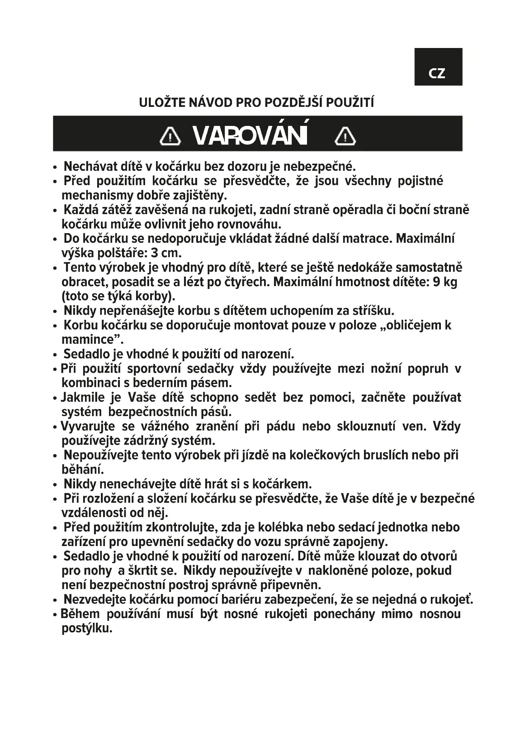 - V případě nedodržení zde uvedených pokynů můžete ohrozit bezpeč- nost Vašeho dítěte.