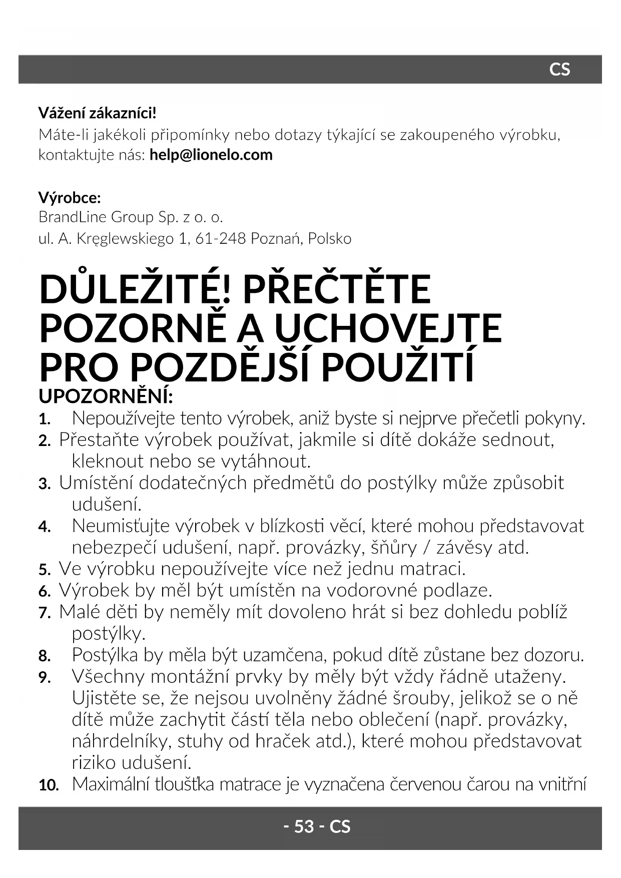 Vážení zákazníci! Máte-li jakékoli připomínky nebo dotazy týkající se zakoupeného výrobku, kontaktujte nás: help@lionelo.com Výrobce: BrandLine Group Sp. z o. o. ul. A. Kręglewskiego 1, 61-248 Poznań, Polsko DŮLEŽITÉ! PŘEČTĚTE