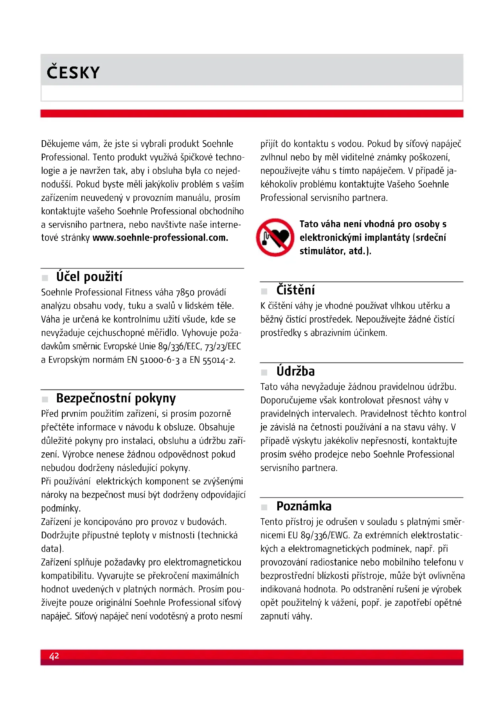 Děkujeme vám, že jste si vybrali produkt Soehnle Professional. Tento produkt využívá špičkové techno- logie a je navržen tak, aby i obsluha byla co nejed- nodušší. Pokud byste měli jakýkoliv problém s vaším zařízením neuvedený v provozním manuálu, prosím kontaktujte vašeho Soehnle Professional obchodního a servisního partnera, nebo navštivte naše interne- tové stránky www.soehnle-professional.com. ■ Účel použití Soehnle Professional Fitness váha 7850 provádí analýzu obsahu vody, tuku a svalů v lidském těle. Váha je určená ke kontrolnímu užití všude, kde se nevyžaduje cejchuschopné měřidlo. Vyhovuje poža- davkům směrnic Evropské Unie 89/336/EEC, 73/23/EEC a Evropským normám EN 51000-6-3 a EN 55014-2. ■ Bezpečnostní pokyny Před prvním použitím zařízení, si prosím pozorně přečtěte informace v návodu k obsluze. Obsahuje důležité pokyny pro instalaci, obsluhu a údržbu zaří- zení. Výrobce nenese žádnou odpovědnost pokud nebudou dodrženy následující pokyny. Při používání elektrických komponent se zvýšenými nároky na bezpečnost musí být dodrženy odpovídající podmínky. Zařízení je koncipováno pro provoz v budovách. Dodržujte přípustné teploty v místnosti (technická data). Zařízení splňuje požadavky pro elektromagnetickou kompatibilitu. Vyvarujte se překročení maximálních hodnot uvedených v platných normách. Prosím pou- žívejte pouze originální Soehnle Professional síťový napáječ. Síťový napáječ není vodotěsný a proto nesmí přijít do kontaktu s vodou. Pokud by síťový napáječ zvlhnul nebo by měl viditelné známky poškození, nepoužívejte váhu s tímto napáječem. V případě ja- kéhokoliv problému kontaktujte Vašeho Soehnle Professional servisního partnera. Tato váha není vhodná pro osoby s elektronickými implantáty (srdeční stimulátor, atd.). ■ Čištění K čištění váhy je vhodné používat vlhkou utěrku a běžný čistící prostředek. Nepoužívejte žádné čistící prostředky s abrazivním účinkem. ■ Údržba Tato váha nevyžaduje žádnou pravidelnou údržbu. Doporučujeme však kontrolovat přesnost váhy v pravidelných intervalech. Pravidelnost těchto kontrol je závislá na četnosti používání a na stavu váhy. V případě výskytu jakékoliv nepřesností, kontaktujte prosím svého prodejce nebo Soehnle Professional servisního partnera. ■ Poznámka Tento přístroj je odrušen v souladu s platnými směr- nicemi EU 89/336/EWG. Za extrémních elektrostatic- kých a elektromagnetických podmínek, např. při provozování radiostanice nebo mobilního telefonu v bezprostřední blízkosti přístroje, může být ovlivněna indikovaná hodnota. Po odstranění rušení je výrobek opět použitelný k vážení, popř. je zapotřebí opětné zapnutí váhy.43 CESKY