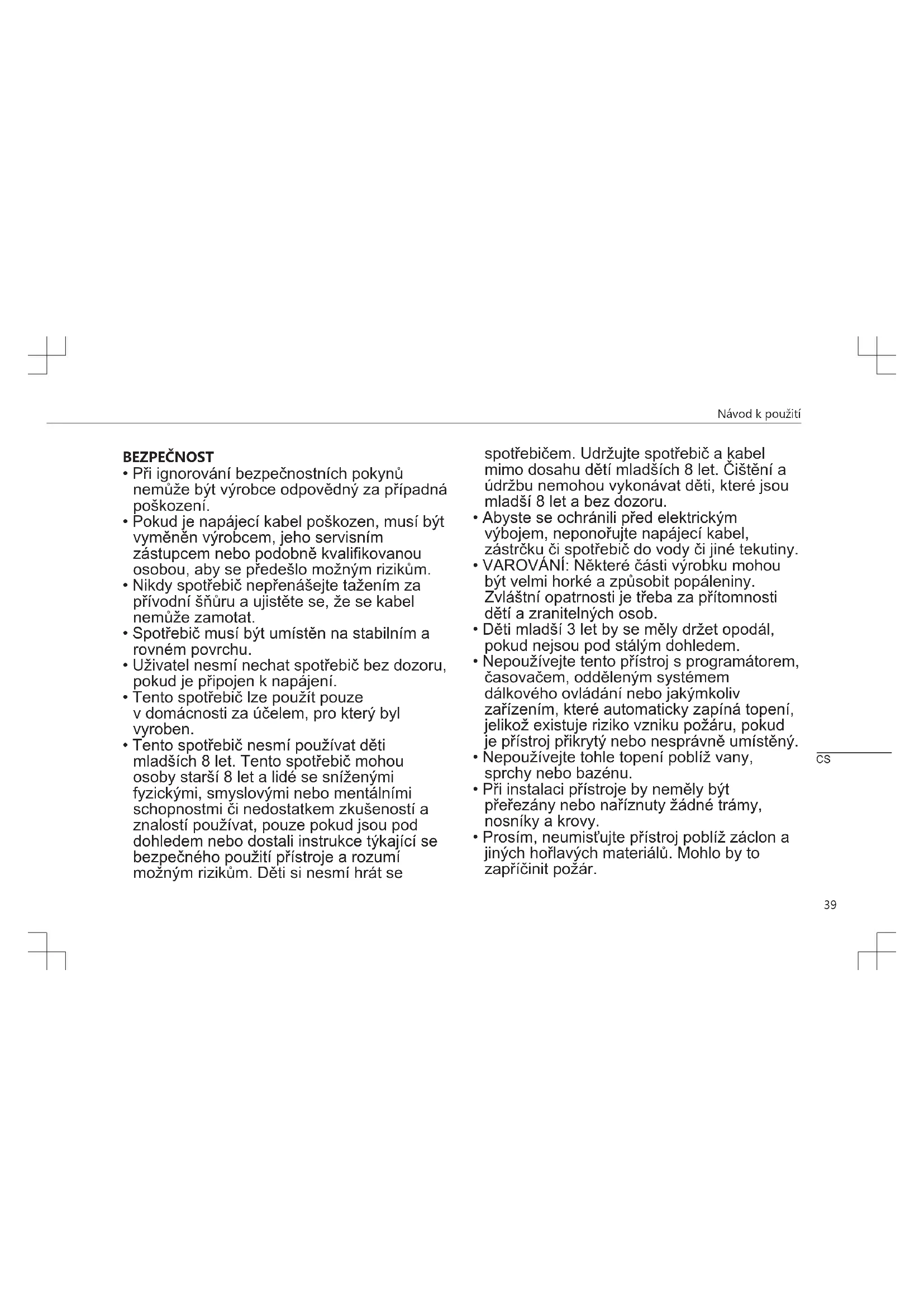 - Prosím, neumisťujte přístroj poblíž záclon a jiných hořlavých materiálů. Mohlo by to zapříčinit požár. CSNávod k použití