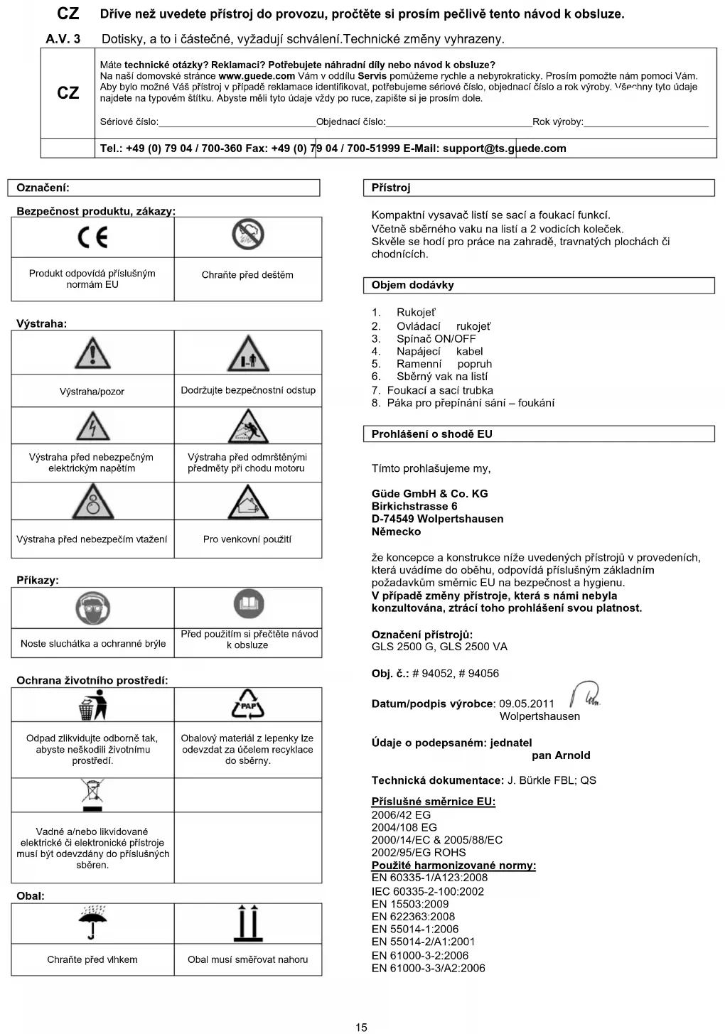 Vyhlásenie o zhode EÚTímto prohlašujeme my,Güde GmbH & Co. KGBirkichstrasse 6D-74549 WolpertshausenNěmecko že koncepce a konstrukce níže uvedených přístrojů v provedeních, která uvádíme do oběhu, odpovídá příslušným základním požadavkům směrnic EU na bezpečnost a hygienu. V případě změny přístroje, která s námi nebyla konzultována, ztrácí toho prohlášení svou platnost. Označení přístrojů: GLS 2500 G, GLS 2500 VAObj. č.:# 94052, # 94056Datum/podpis výrobce: 09.05.2011 WolpertshausenÚdaje o podepsaném: jednatelpan ArnoldTechnická dokumentace: J. Bürkle FBL; QS Příslušné směrnice EU: 2006/42 EG2004/108 EG2000/14/EC & 2005/88/EC2002/95/EG ROHSPoužité harmonizované normy:EN 60335-1/A123:2008IEC 60335-2-100:2002EN 15503:2009EN 622363:2008EN 55014-1:2006EN 55014-2/A1:2001EN 61000-3-2:2006EN 61000-3-3/A2:2006