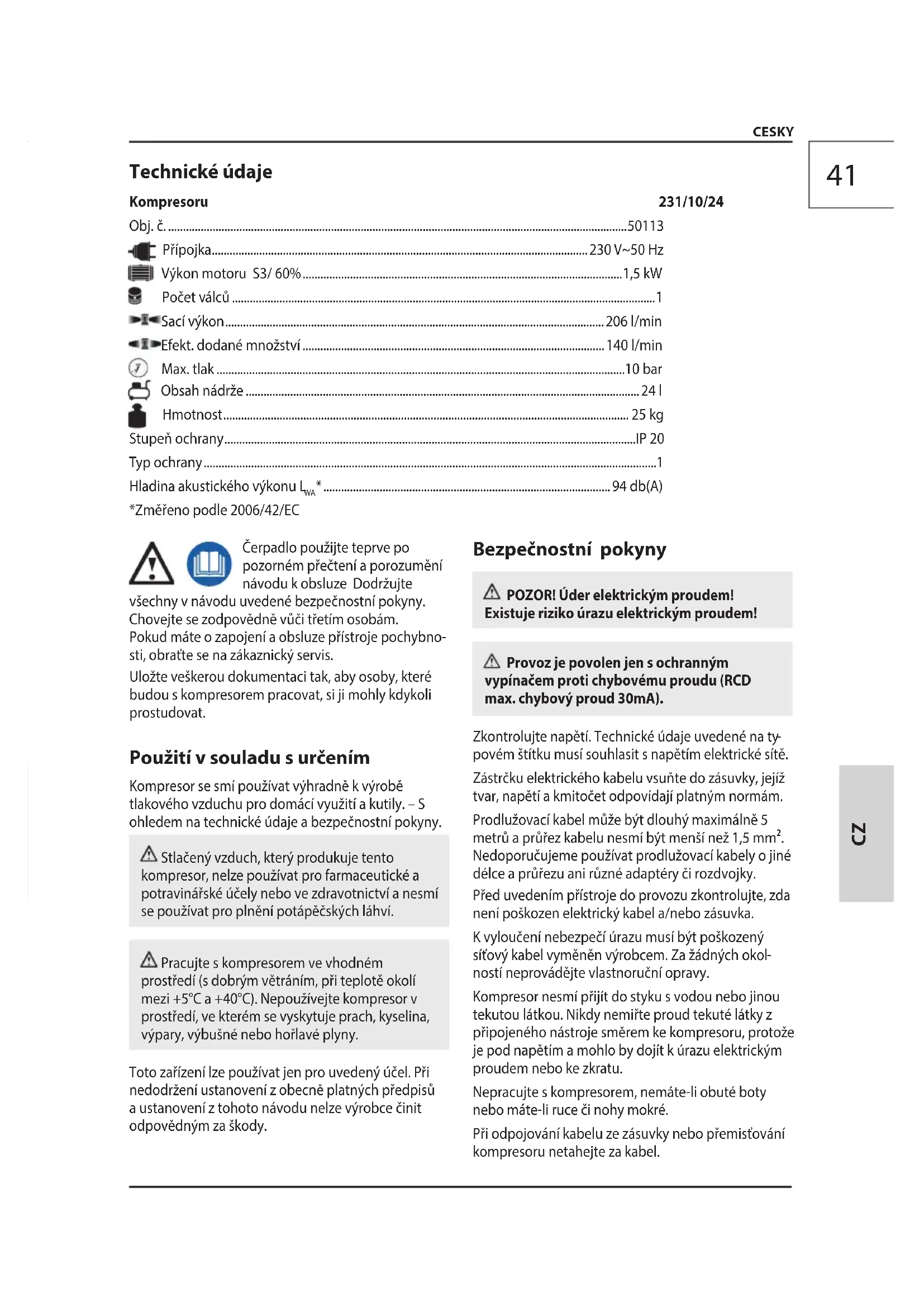 ností neprovádějte vlastnoruční opravy. Kompresor nesmí přijít do styku s vodou nebo jinou tekutou látkou. Nikdy nemiřte proud tekuté látky z připojeného nástroje směrem ke kompresoru, protože je pod napětím a mohlo by dojít k úrazu elektrickým proudem nebo ke zkratu. Nepracujte s kompresorem, nemáte-li obuté boty nebo máte-li ruce či nohy mokré. Při odpojování kabelu ze zásuvky nebo přemisťování kompresoru netahejte za kabel. Technické údaje Kompresoru 231/10/2442 teploty, tato ochrana by automaticky přerušila přívod elektrického proudu. Po návratu na normální teplotu se motor spustí automaticky. Pozor! Kompresor nikdy nezapínejte resp. nevypínejte pomocí zástrčky. Vždy stiskněte tlakový spínač. Kompresor nenechávejte zapnutý přes noc, mohl by se stát zdrojem nebezpečí. Na konci pracovního dne vypněte vždy na zapínači/ vypínači, vypusťte vzdušník a kompresor odpojte ze sítě. Pozor: nevypuštěná kondenzovaná voda může být příčinou koroze uvnitř nádrže a omezit tak její výkonnost a ohrozit bezpečnost. Nenechávejte kompresor vystavený atmosférickým vlivům (déšť, slunce, mlha, sníh). Pokud budete kompresor používat venku, nezapomeňte je po použití vždy uložit na kryté nebo uzavřené místo. Kompresor nikdy nepoužívejte venku v dešti nebo za jiných nepříznivých meteorologických podmínek. Do blízkosti kompresoru nebo na kompresor nepo