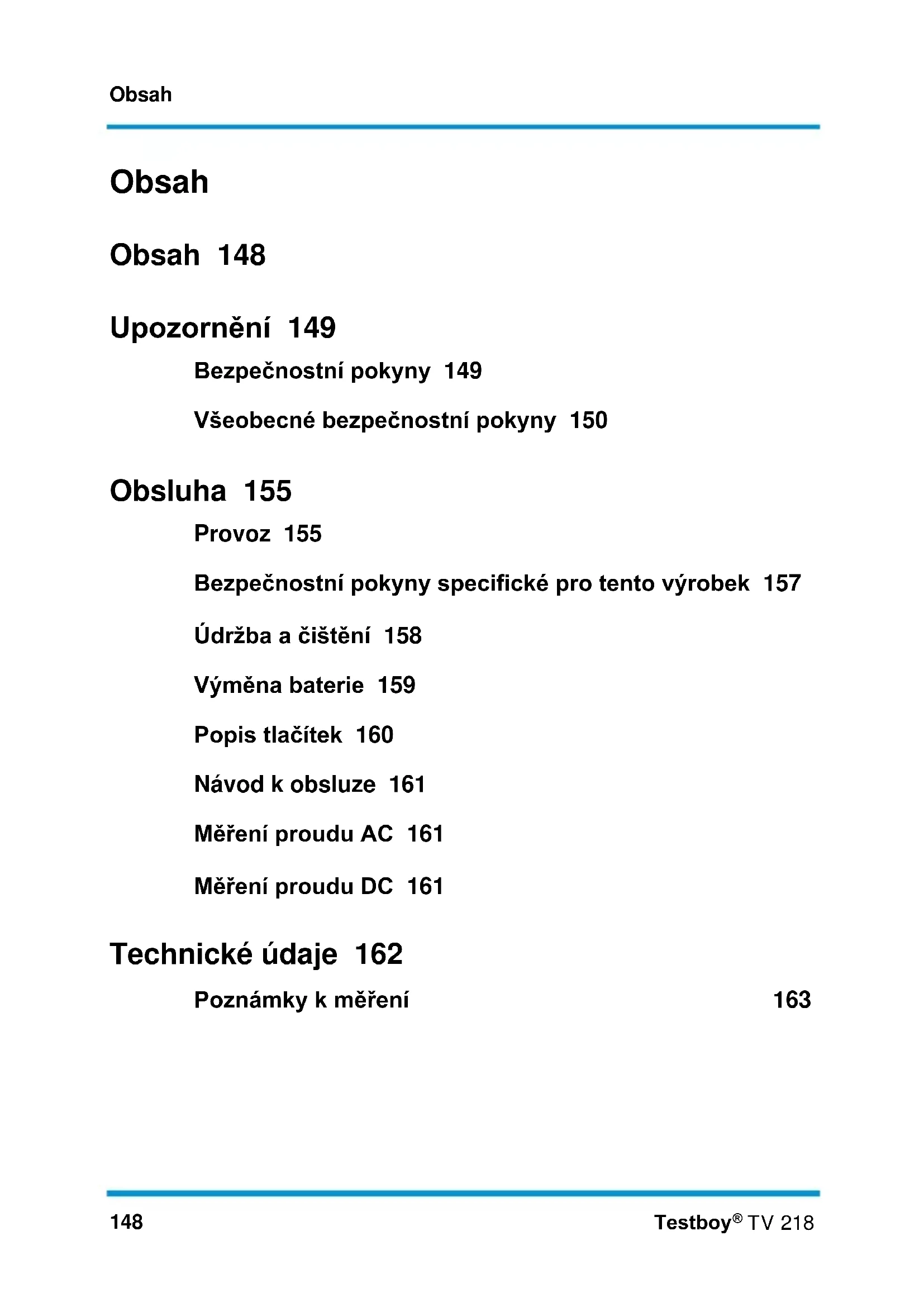 TV 218 Obsah Obsah 148 Upozornění 149 Bezpečnostní pokyny 149 Všeobecné bezpečnostní pokyny 150 Obsluha 155 Provoz 155 Bezpečnostní pokyny specifické pro tento výrobek 157 Údržba a čištění 158 Výměna baterie 159 Popis tlačítek 160 Návod k obsluze 161 Měření proudu AC 161 Měření proudu DC 161 Technické údaje 162 Poznámky k měření 163Upozornění Testboy