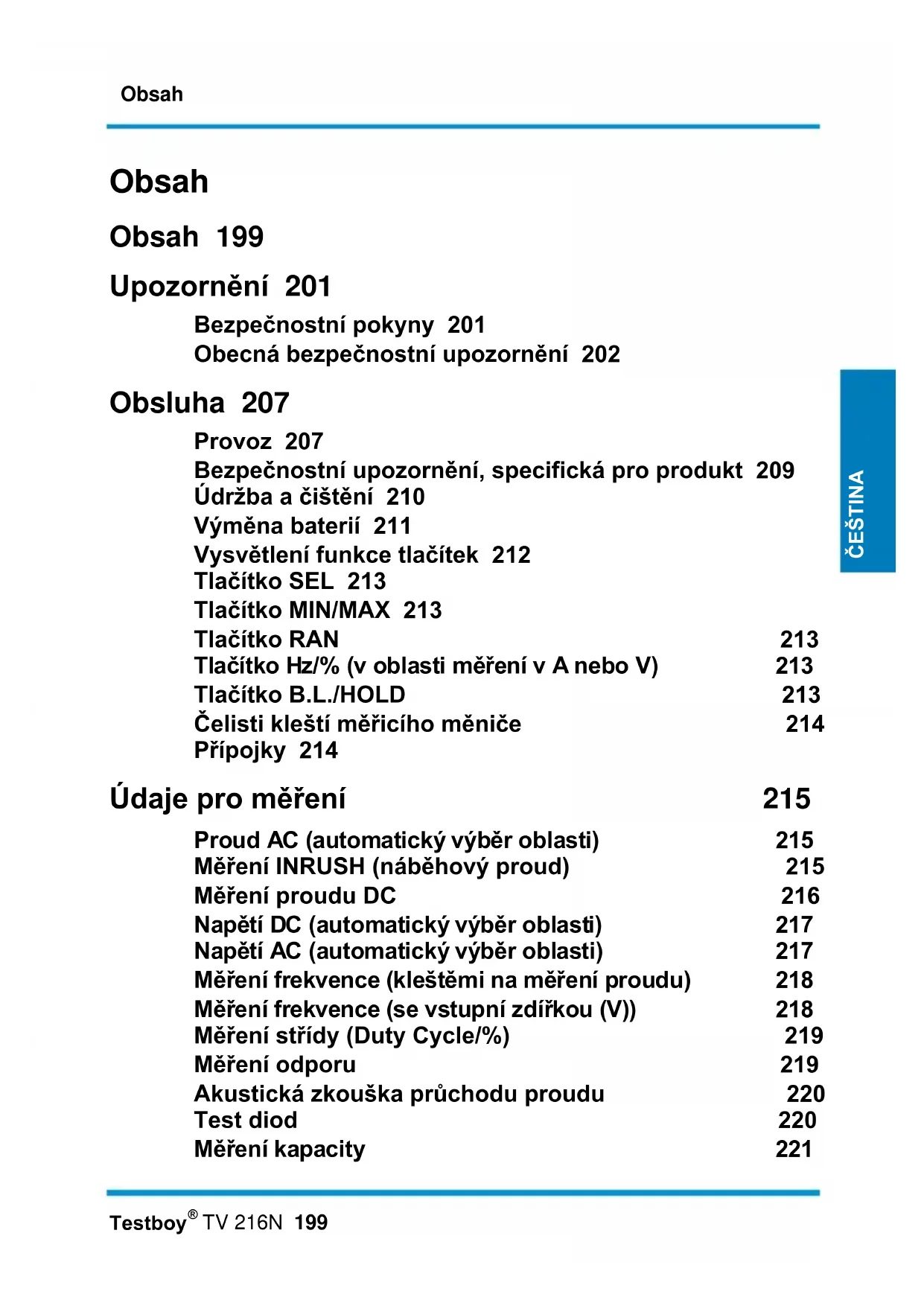 TV 216N 199 ČEŃTINA ČEŃTINA ČEŃTINA Obsah Obsah 199 Upozornění 201 Bezpečnostní pokyny 201 Obecná bezpečnostní upozornění 202 Obsluha 207 Provoz 207 Bezpečnostní upozornění, specifická pro produkt 209 Údržba a čištění 210 Výměna baterií 211 Vysvětlení funkce tlačítek 212 Tlačítko SEL 213 Tlačítko MIN/MAX 213 Tlačítko RAN 213 Tlačítko Hz/% (v oblasti měření v A nebo V) 213 Tlačítko B.L./HOLD 213 Čelisti kleští měřicího měniče 214 Přípojky 214 Údaje pro měření 215 Proud AC (automatický výběr oblasti) 215 Měření INRUSH (náběhový proud) 215 Měření proudu DC 216 Napětí DC (automatický výběr oblasti) 217 Napětí AC (automatický výběr oblasti) 217 Měření frekvence (kleštěmi na měření proudu) 218 Měření frekvence (se vstupní zdířkou (V)) 218 Měření střídy (Duty Cycle/%) 219 Měření odporu 219 Akustická zkouška průchodu proudu 220 Test diod 220 Měření kapacity 221Obsah