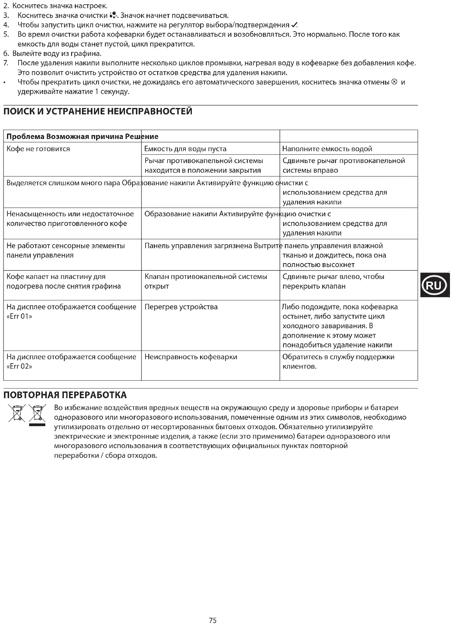 Problém Možná příčina Řešení Na displeji je zobrazeno "Err 01". Přístroj se přehřál. Můžete počkat, až kávovar vychladne, anebo můžete spustit cyklus vaření kávy za studena. Možná bude nutné i odvápnění spotřebiče. Na displeji je zobrazeno "Err 02". Spotřebič v poruše Obraťte se na zákaznický servis. RECYKLACE