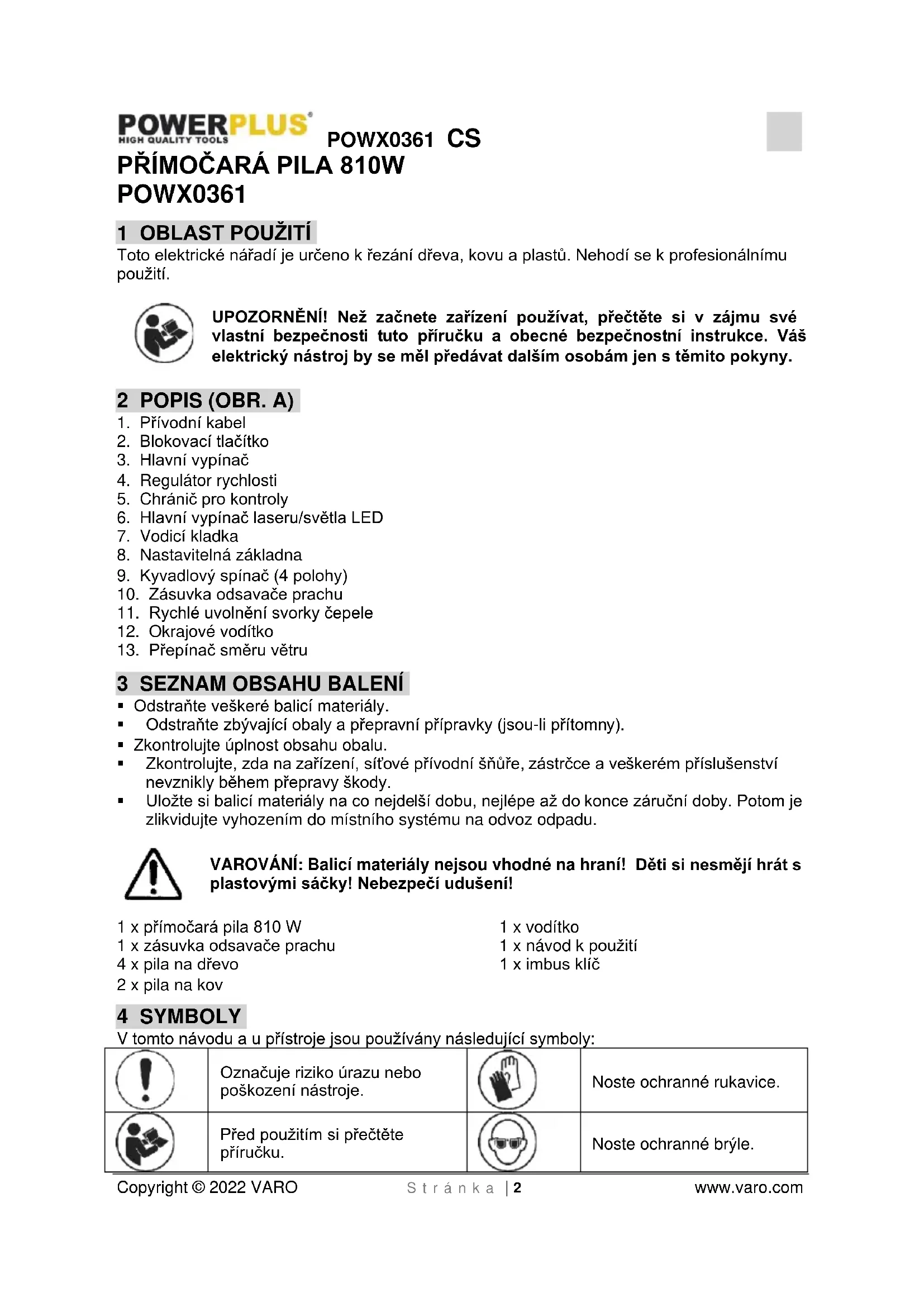 Elektronické ovládání rychlosti Ano Nastavitelná základna Ano Hloubka řezu v oceli 8 mm Hloubka řezu ve dřevě 80 mm Hloubka řezu v plastu 60mm Typ elektromotoru Kartáčový Typ připojení Tvar T a U Rychlá výměna pilového listu Ano Měkký úchop Ano Vypínač odfukování prachu Ano Materiál základny Ocel 9 HLUČNOST Hodnoty hlukových emisí se měří podle příslušné normy. (K=3) Úroveň akustického tlaku LpA 91dB(A) Úroveň akustického výkonu LwA 102dB(A) POZOR! Hladina akustického tlaku může přesáhnout 85 dB(A), v takovém případě noste individuální chránič sluchu. aw (Vibrace): 4.3m/s² K = 1,5 m/s²POWX0361 CS Copyright © 2022 VARO S t r á n k a | 7 www.varo.com 10 ZÁRUKA