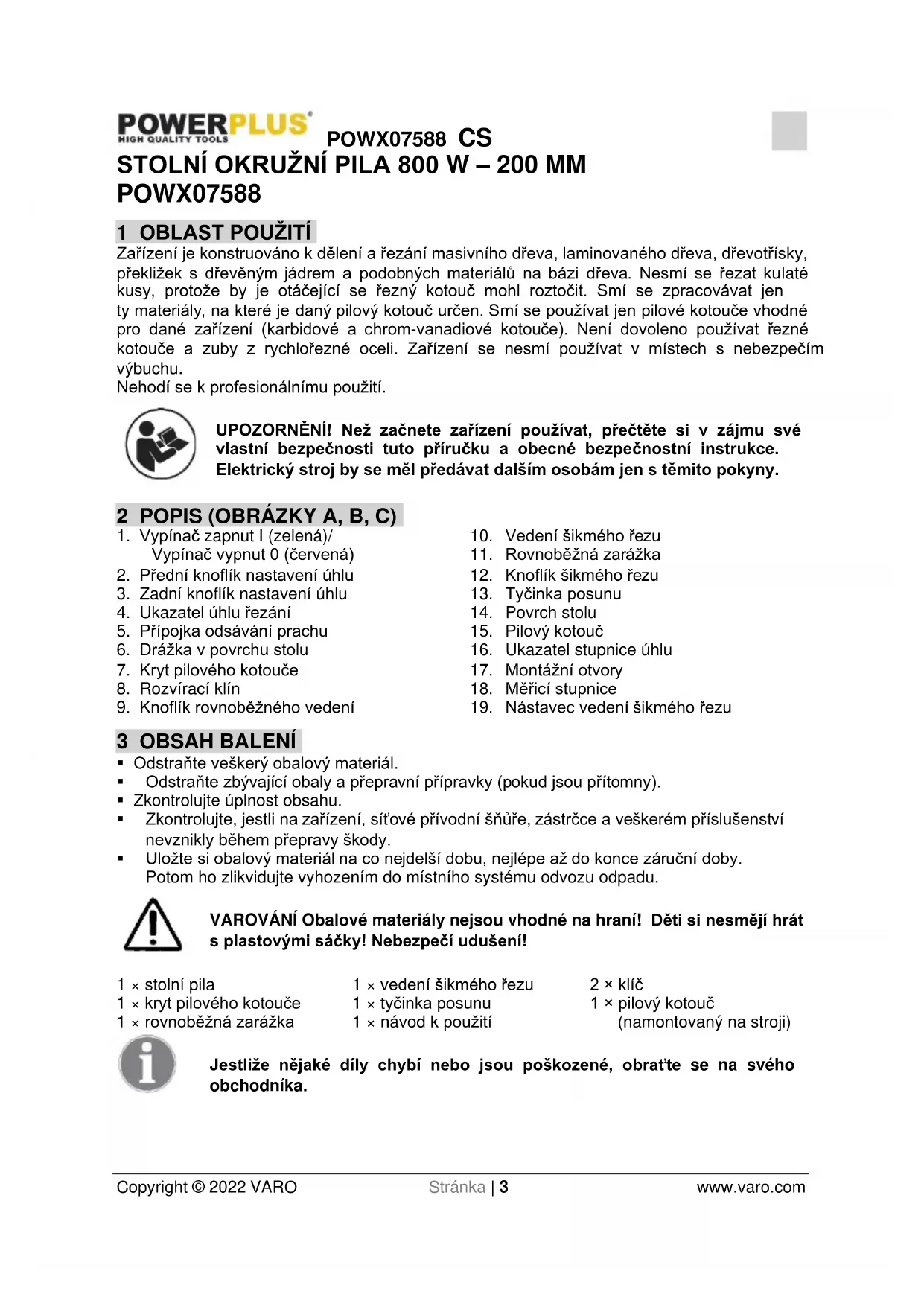 - Uložte si obalový materiál na co nejdelší dobu, nejlépe až do konce záruční doby. Potom ho zlikvidujte vyhozením do místního systému odvozu odpadu. VAROVÁNÍ Obalové materiály nejsou vhodné na hraní! Děti si nesmějí hrát s plastovými sáčky! Nebezpečí udušení! 1 × stolní pila 1 × kryt pilového kotouče 1 × rovnoběžná zarážka 1 × vedení šikmého řezu 1 × tyčinka posunu 1 × návod k použití 2 × klíč 1 × pilový kotouč (namontovaný na stroji) Jestliže nějaké díly chybí nebo jsou poškozené, obraťte se na svého obchodníka.POWX07588 CS Copyright © 2022 VARO Stránka | 4 www.varo.com 4 SYMBOLY V tomto návodu nebo na stroji se používají následující symboly: