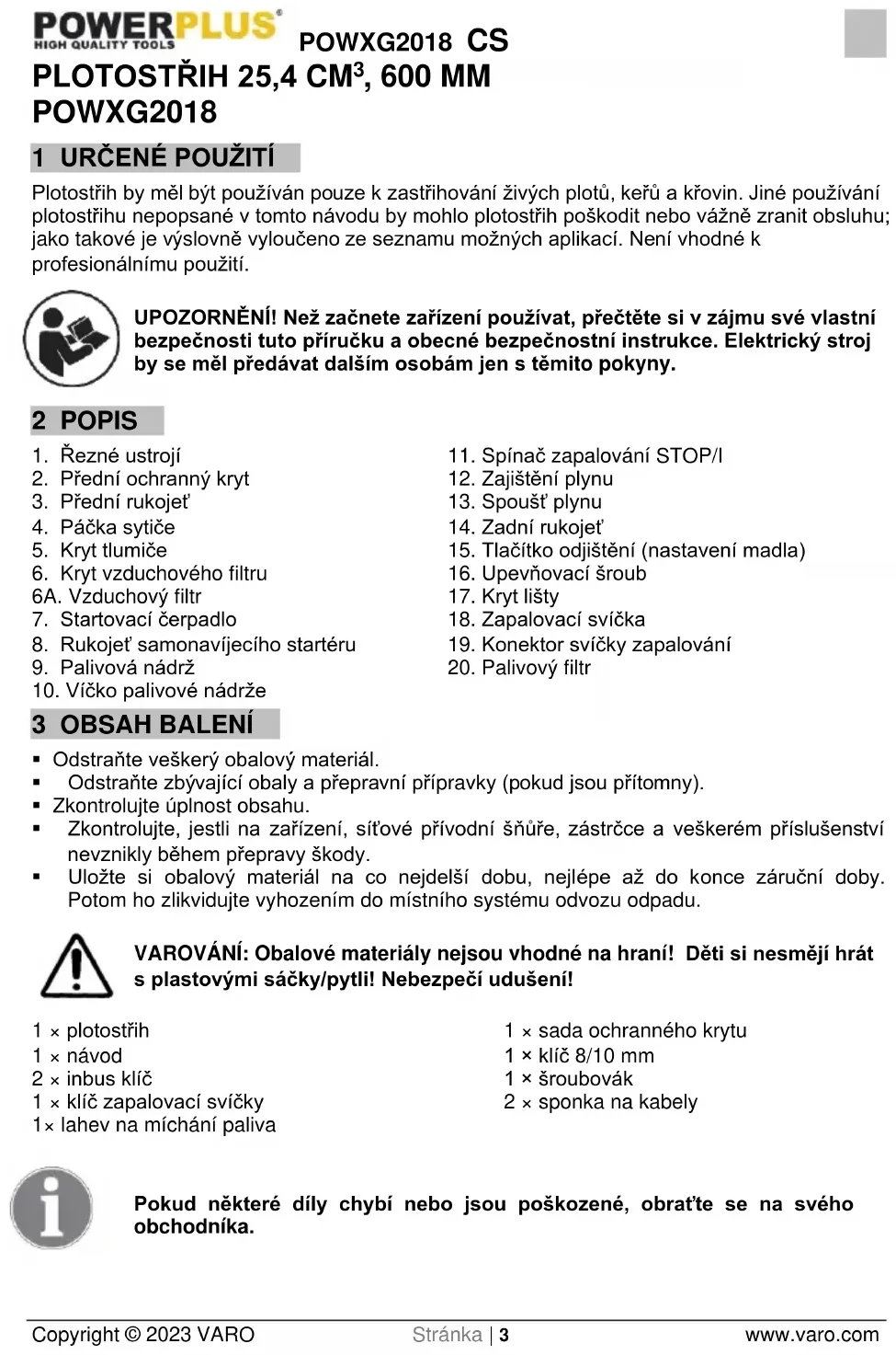 - Uložte si obalový materiál na co nejdelší dobu, nejlépe až do konce záruční doby. Potom ho zlikvidujte vyhozením do místního systému odvozu odpadu. VAROVÁNÍ: Obalové materiály nejsou vhodné na hraní! Děti si nesmějí hrát s plastovými sáčky/pytli! Nebezpečí udušení! 1 × plotostřih 1 × návod 2 × inbus klíč 1 × klíč zapalovací svíčky 1× lahev na míchání paliva 1 × sada ochranného krytu 1 × klíč 8/10 mm 1 × šroubovák 2 × sponka na kabely Pokud některé díly chybí nebo jsou poškozené, obraťte se na svého obchodníka.POWXG2018 CS Copyright © 2023 VARO Stránka | 4 www.varo.com 4 SYMBOLY V tomto návodu nebo na stroji se používají následující symboly: