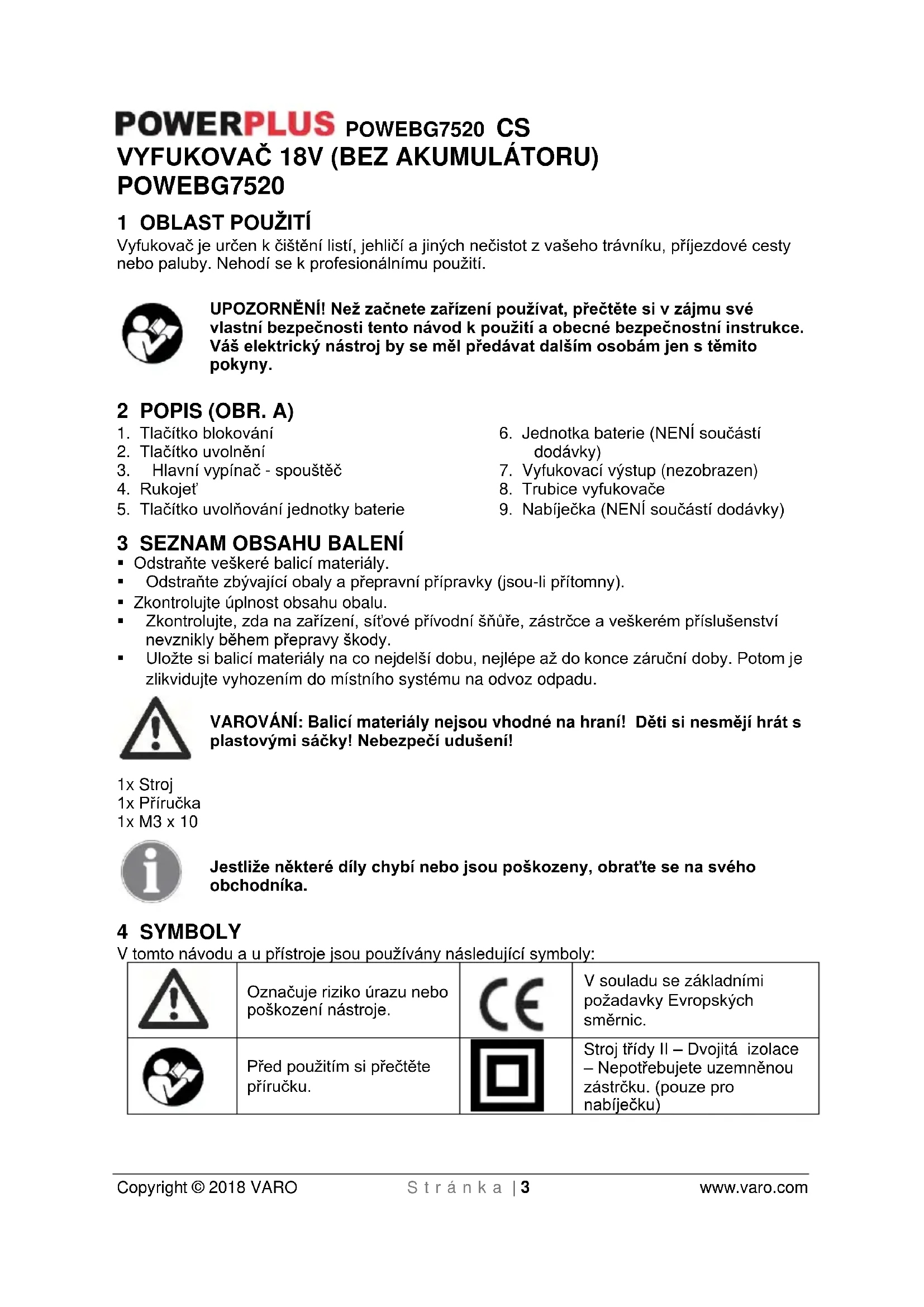 Stroj třídy II – Dvojitá izolace – Nepotřebujete uzemněnou zástrčku. (pouze pro nabíječku)POWEBG7520 CS Copyright © 2018 VARO S t r á n k a | 4 www.varo.com