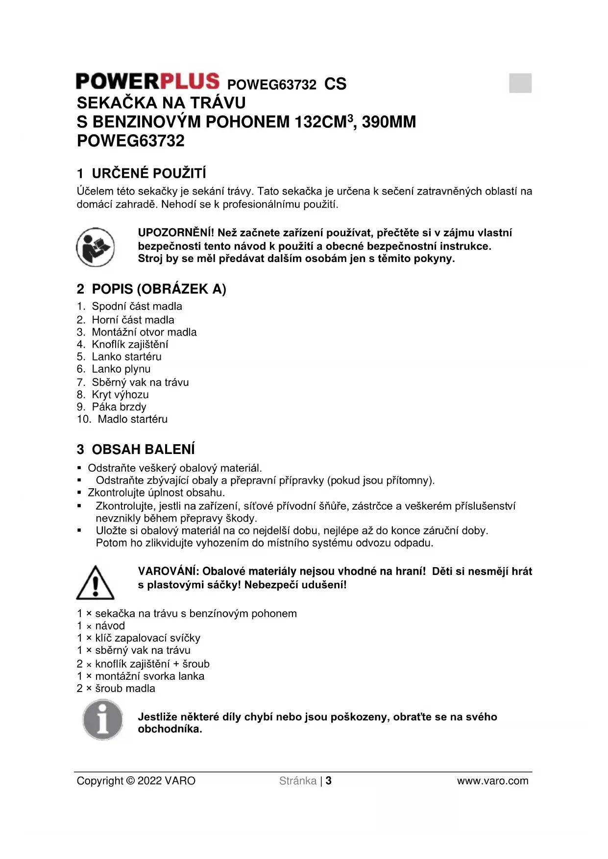 - Uložte si obalový materiál na co nejdelší dobu, nejlépe až do konce záruční doby. Potom ho zlikvidujte vyhozením do místního systému odvozu odpadu. VAROVÁNÍ: Obalové materiály nejsou vhodné na hraní! Děti si nesmějí hrát s plastovými sáčky! Nebezpečí udušení! 1 × sekačka na trávu s benzínovým pohonem 1 × návod 1 × klíč zapalovací svíčky 1 × sběrný vak na trávu 2 × knoflík zajištění + šroub 1 × montážní svorka lanka 2 × šroub madla Jestliže některé díly chybí nebo jsou poškozeny, obraťte se na svého obchodníka.POWEG63732 CS Copyright © 2022 VARO Stránka | 4 www.varo.com 4 SYMBOLY V tomto návodu a na stroji jsou používány následující symboly: