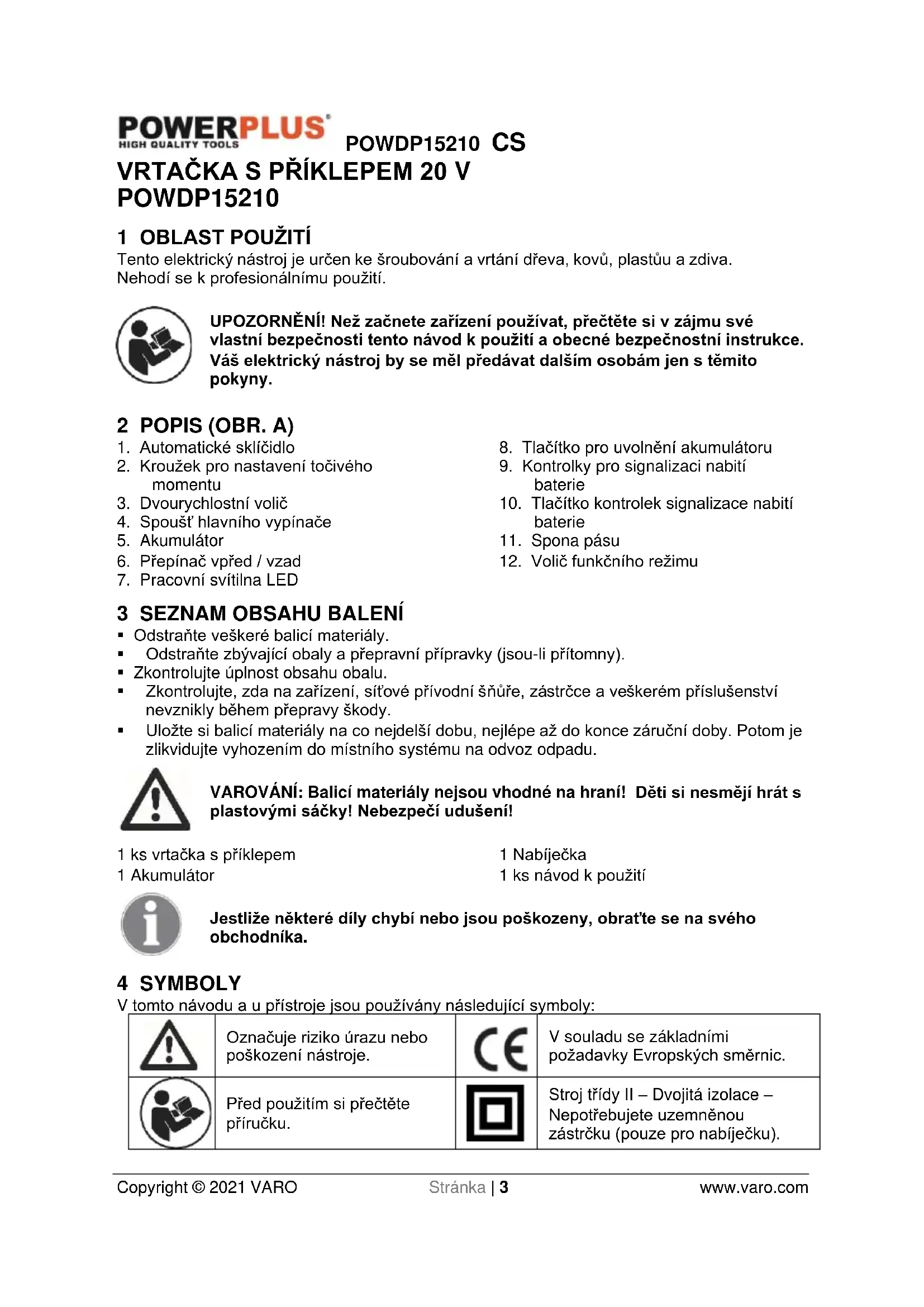 Stroj třídy II – Dvojitá izolace – Nepotřebujete uzemněnou zástrčku (pouze pro nabíječku).POWDP15210 CS Copyright © 2021 VARO Stránka | 4 www.varo.com