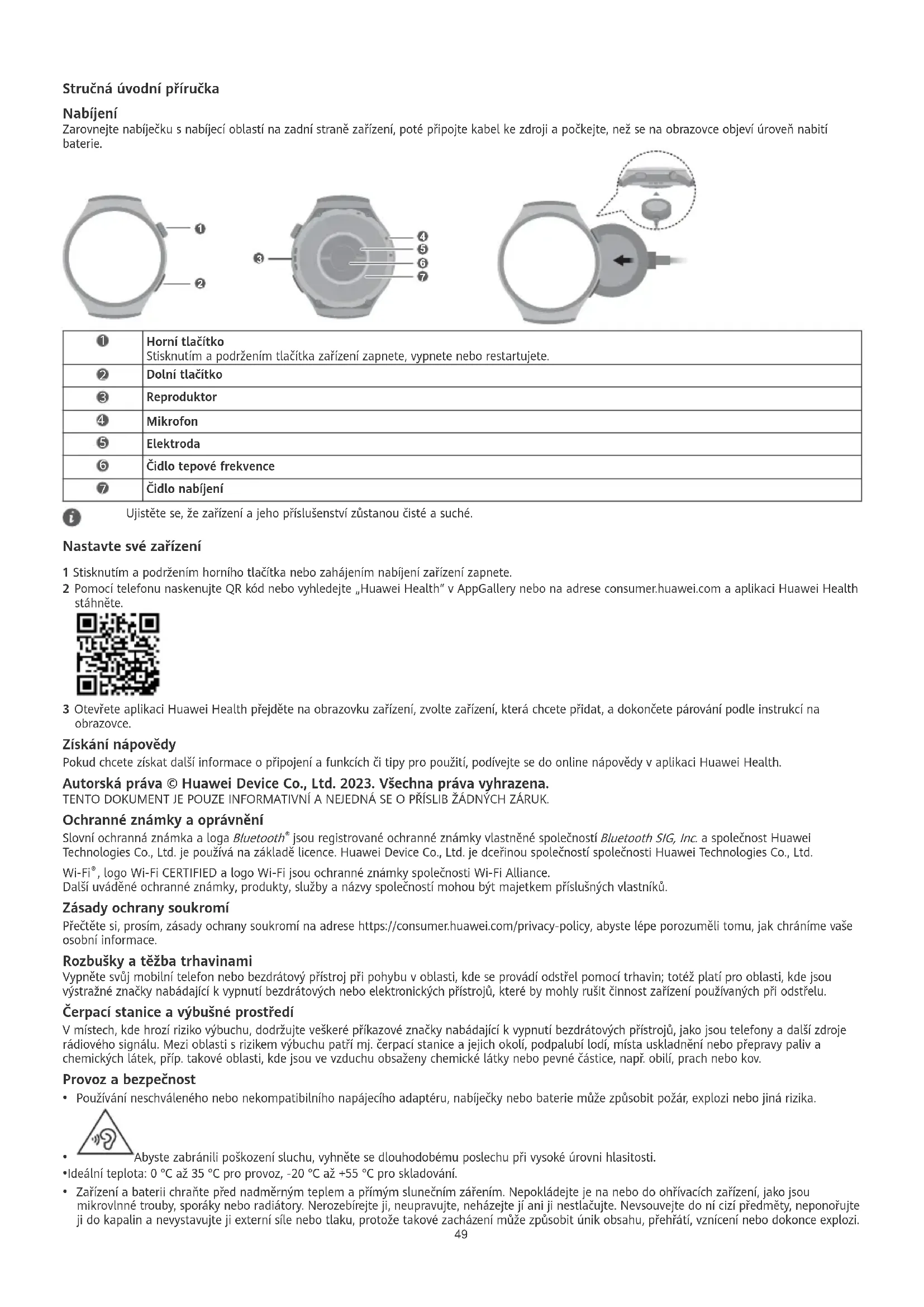 Čidlo nabíjení Ujistěte se, že zařízení a jeho příslušenství zůstanou čisté a suché. Nastavte své zařízení 1 Stisknutím a podržením horního tlačítka nebo zahájením nabíjení zařízení zapnete. 2 Pomocí telefonu naskenujte QR kód nebo vyhledejte „Huawei Health“ v AppGallery nebo na adrese consumer.huawei.com a aplikaci Huawei Health stáhněte. 3 Otevřete aplikaci Huawei Health přejděte na obrazovku zařízení, zvolte zařízení, která chcete přidat, a dokončete párování podle instrukcí na obrazovce. Získání nápovědy Pokud chcete získat další informace o připojení a funkcích či tipy pro použití, podívejte se do online nápovědy v aplikaci Huawei Health. Autorská práva © Huawei Device Co., Ltd. 2023. Všechna práva vyhrazena. TENTO DOKUMENT JE POUZE INFORMATIVNÍ A NEJEDNÁ SE O PŘÍSLIB ŽÁDNÝCH ZÁRUK. Ochranné známky a oprávnění Slovní ochranná známka a loga Bluetooth