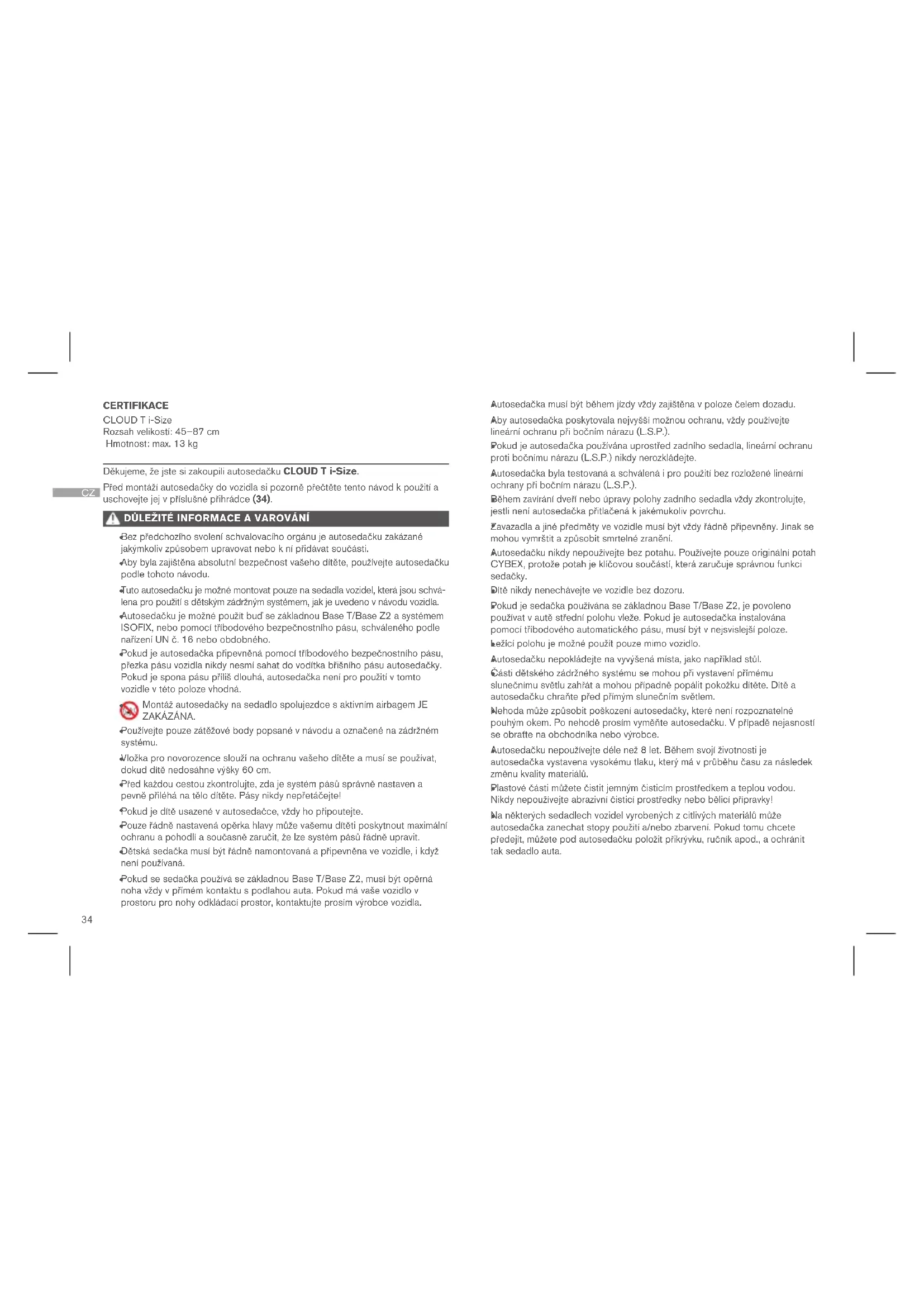 Děkujeme, že jste si zakoupili autosedačku CLOUD T i-Size. Před montáží autosedačky do vozidla si pozorně přečtěte tento návod k použití a uschovejte jej v příslušné přihrádce (34). DŮLEŽITÉ INFORMACE A VAROVÁNÍ