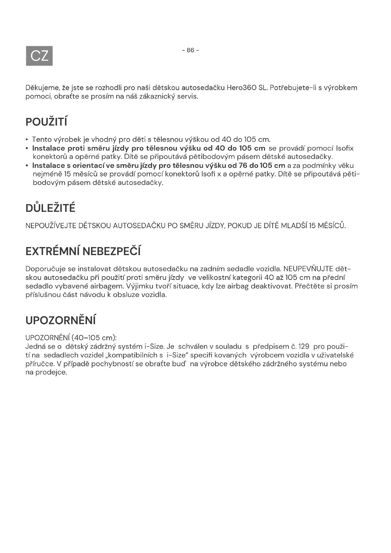 Doporučuje se instalovat dětskou autosedačku na zadním sedadle vozidla. NEUPEVŇUJTE dět- skou autosedačku při použití proti směru jízdy ve velikostní kategorii 40 až 105cm na přední sedadlo vybavené airbagem. Výjimku tvoří situace, kdy lze airbag deaktivovat. Přečtěte si prosím příslušnou část návodu k obsluze vozidla. UPOZORNĚNÍ UPOZORNĚNÍ (40–105cm): Jedná se o dětský zádržný systém i-Size. Je schválen v souladu s předpisem č.129 pro použi- tí na sedadlech vozidel „kompatibilních s i-Size“ specifi kovaných výrobcem vozidla v uživatelské příručce. V případě pochybností se obraťte buď na výrobce dětského zádržného systému nebo na prodejce.- 87 -