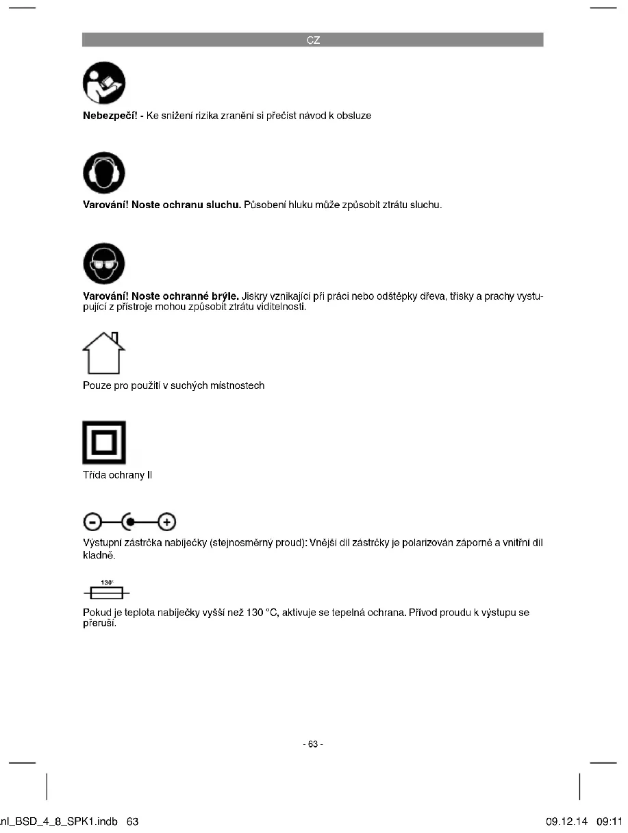 Nebezpečí! - Ke snížení rizika zranění si přečíst návod k obsluze Varování! Noste ochranu sluchu. Působení hluku může způsobit ztrátu sluchu. Varování! Noste ochranné brýle. Jiskry vznikající při práci nebo odštěpky dřeva, třísky a prachy vystu- pující z přístroje mohou způsobit ztrátu viditelnosti. Pouze pro použití v suchých místnostech Třída ochrany II Výstupní zástrčka nabíječky (stejnosměrný proud): Vnější díl zástrčky je polarizován záporně a vnitřní díl kladně. 130° Pokud je teplota nabíječky vyšší než 130 °C, aktivuje se tepelná ochrana. Přívod proudu k výstupu se přeruší. Anl_BSD_4_8_SPK1.indb 63Anl_BSD_4_8_SPK1.indb 63 09.12.14 09:1109.12.14 09:11CZ