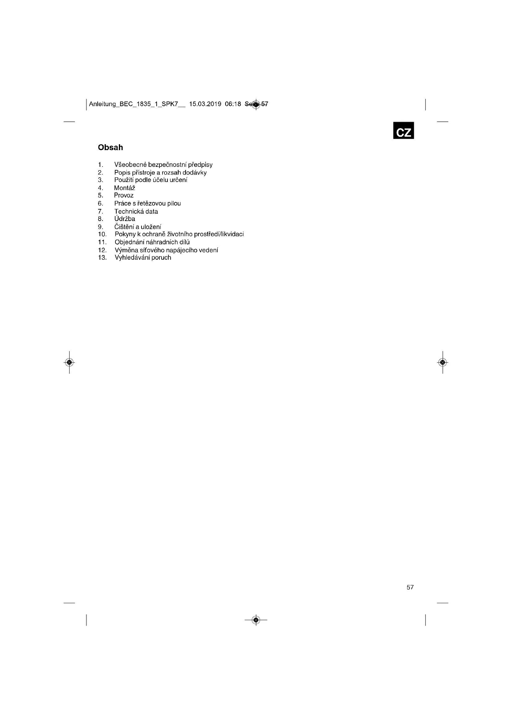 rozběhnout. Na uvolnění brzdy řetězu vraťte přední ochranu rukou zpět (obr. 1/pol. 2), až zaskočí. Anleitung_BEC_1835_1_SPK7__ 15.03.2019 06:18 Seite 59CZ