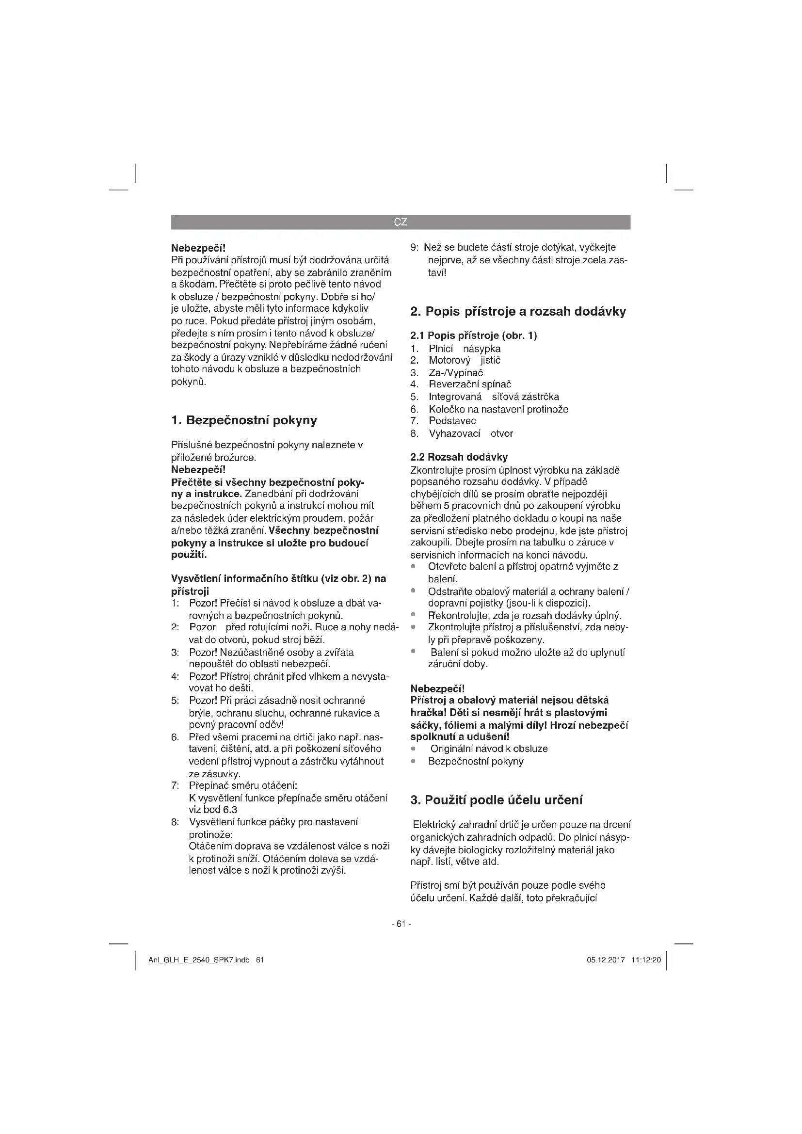 Elektrický zahradní drtič je určen pouze na drcení organických zahradních odpadů. Do plnicí násyp- ky dávejte biologicky rozložitelný materiál jako např. listí, větve atd. Přístroj smí být používán pouze podle svého účelu určení. Každé další, toto překračující Anl_GLH_E_2540_SPK7.indb 61Anl_GLH_E_2540_SPK7.indb 61 05.12.2017 11:12:2005.12.2017 11:12:20CZ