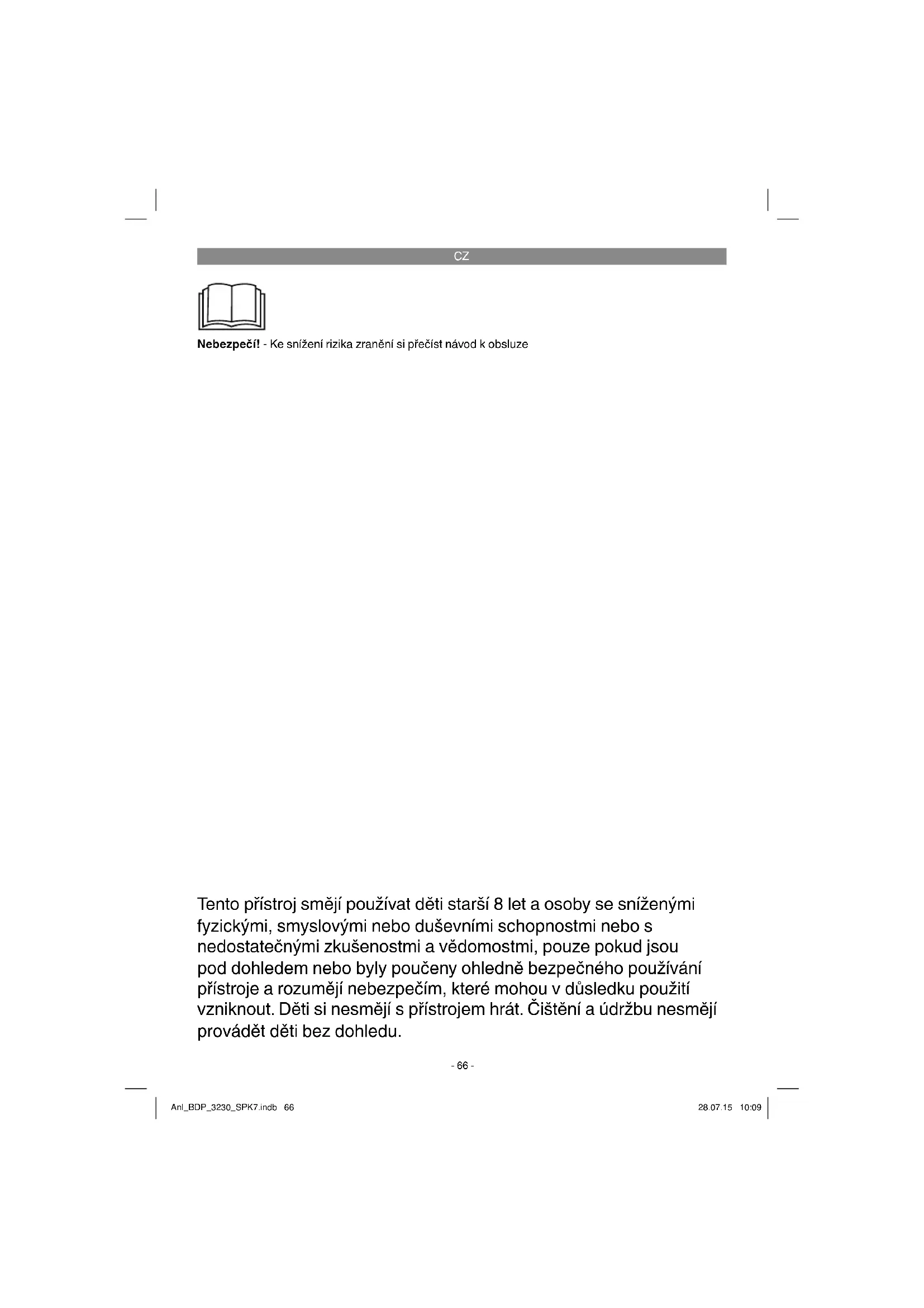 Nebezpečí! - Ke snížení rizika zranění si přečíst návod k obsluze Tento přístroj smějí používat děti starší 8 let a osoby se sníženými fyzickými, smyslovými nebo duševními schopnostmi nebo s nedostatečnými zkušenostmi a vědomostmi, pouze pokud jsou pod dohledem nebo byly poučeny ohledně bezpečného používání přístroje a rozumějí nebezpečím, které mohou v důsledku použití vzniknout. Děti si nesmějí s přístrojem hrát. Čištění a údržbu nesmějí provádět děti bez dohledu. Anl_BDP_3230_SPK7.indb 66Anl_BDP_3230_SPK7.indb 66 28.07.15 10:0928.07.15 10:09CZ