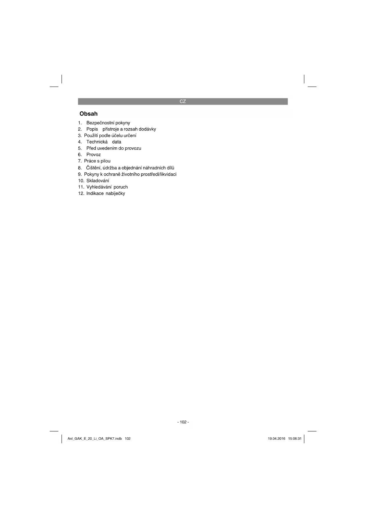 Skladujte přístroj a jeho příslušenství na tmavém, suchém a nezamrzajícím místě a mimo dosah dětí. Optimální teplota skladování leží mezi 5 a 30 ˚C. Uložte elektrický přístroj v originálním ba- lení. Anl_GAK_E_20_Li_OA_SPK7.indb 109Anl_GAK_E_20_Li_OA_SPK7.indb 109 19.04.2016 15:06:3119.04.2016 15:06:31CZ