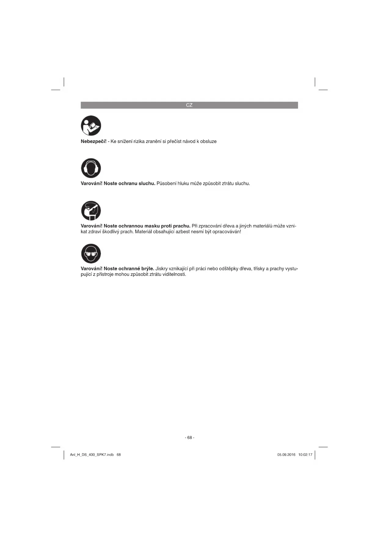 Nebezpečí! - Ke snížení rizika zranění si přečíst návod k obsluze Varování! Noste ochranu sluchu. Působení hluku může způsobit ztrátu sluchu. Varování! Noste ochranné brýle. Jiskry vznikající při práci nebo odštěpky dřeva, třísky a prachy vystu- pující z přístroje mohou způsobit ztrátu viditelnosti. Varování! Noste ochrannou masku proti prachu. Při zpracování dřeva a jiných materiálů může vzni- kat zdraví škodlivý prach. Materiál obsahující azbest nesmí být opracováván! Anl_H_DS_400_SPK7.indb 68Anl_H_DS_400_SPK7.indb 68 05.09.2016 10:02:1705.09.2016 10:02:17CZ