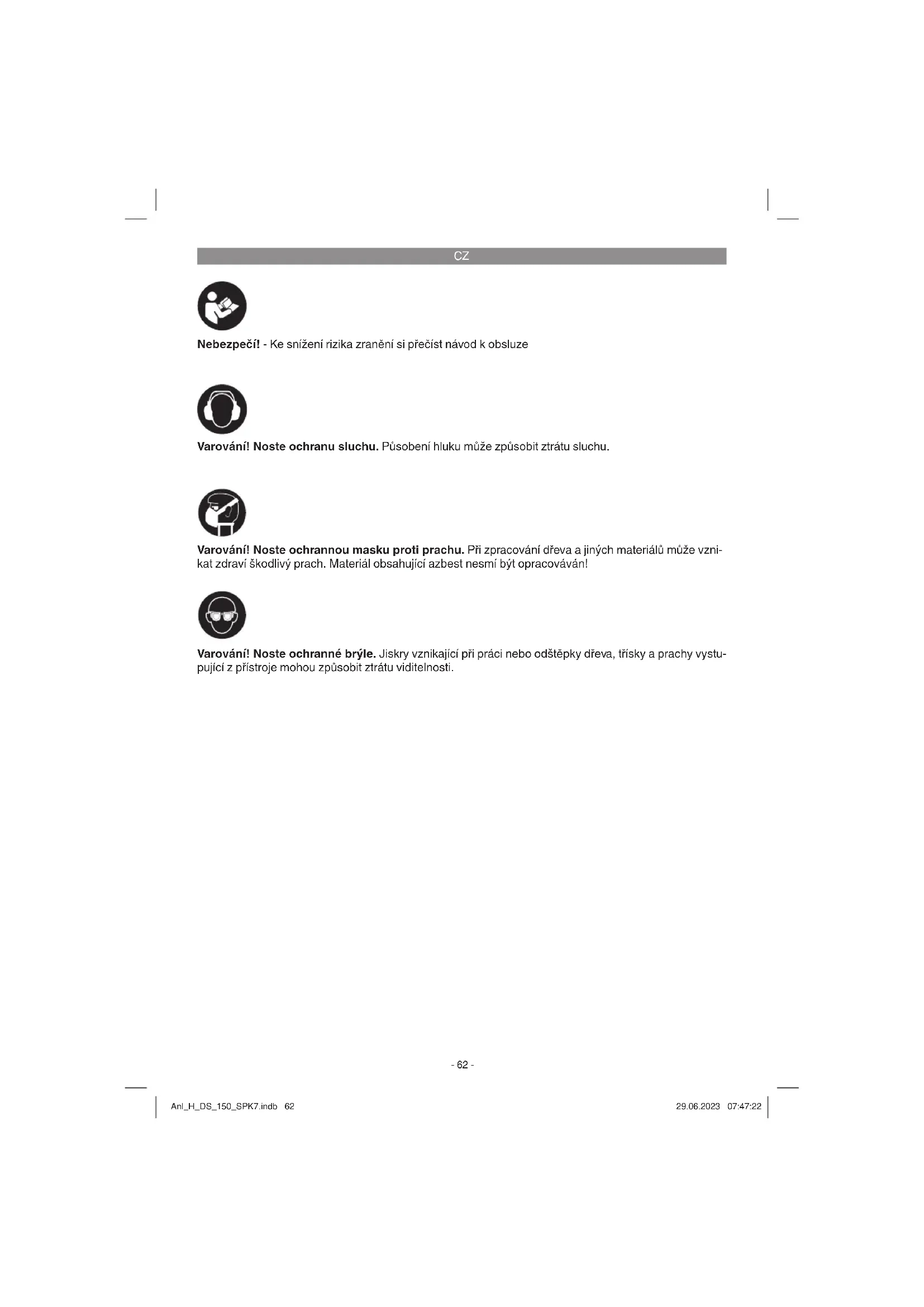 Nebezpečí! - Ke snížení rizika zranění si přečíst návod k obsluze Varování! Noste ochranu sluchu. Působení hluku může způsobit ztrátu sluchu. Varování! Noste ochranné brýle. Jiskry vznikající při práci nebo odštěpky dřeva, třísky a prachy vystu- pující z přístroje mohou způsobit ztrátu viditelnosti. Varování! Noste ochrannou masku proti prachu. Při zpracování dřeva a jiných materiálů může vzni- kat zdraví škodlivý prach. Materiál obsahující azbest nesmí být opracováván! Anl_H_DS_150_SPK7.indb 62Anl_H_DS_150_SPK7.indb 62 29.06.2023 07:47:2229.06.2023 07:47:22CZ