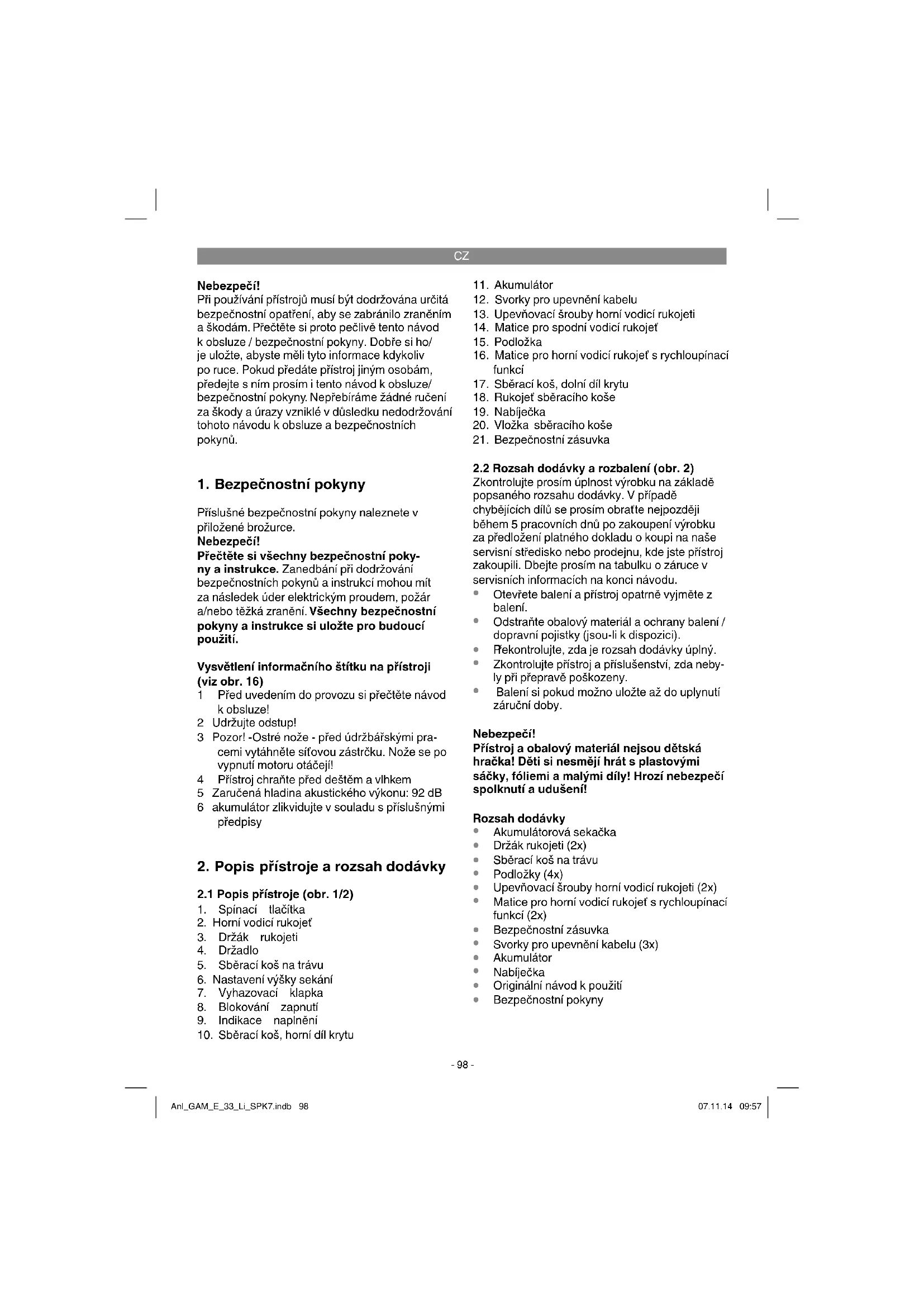 Pozor! Sekačka je vybavena bezpečnostním spínačem, aby se zamezilo používání nepovolanými osoba- mi. Bezprostředně před uvedením sekačky do provozu zasuňte bezpečnostní zástrčku (obr.13) a při každém přerušení nebo ukončení práce zástrčku opět vytáhněte. Pozor! Aby se zabránilo nechtěnému zapnutí, je sekačka vybavena blokováním zapnutí (obr. 4 / pol. 8), které musí být zmáčknuto, než mohou být ak- tivována spínací tlačítka (obr. 4 / pol. 1). Pokud jsou spínací tlačítka uvolněna, sekačka se vypne. Proveďte tento krok několikrát, abyste si byli jisti, že váš přístroj správně pracuje. Před začátkem opravárenských nebo údržbářských prací na přístroji se musíte přesvědčit, že se nůž netočí a bezpečnostní zástrčka je vytažena. Varování! Nikdy neotvírejte vyhazovací klap- ku, když je vyprazdňováno sběrací zařízení a motor ješt ě běží. Rotující nůž může způsobit zranění. Vždy pečlivě upevněte vyhazovací klapku resp. sběrací koš. Při odstraňování nejdříve vypnout motor. Musí být vždy dodržována bezpečnostní vz- dálenost mezi krytem nože a uživatelem daná vodicími rukojeťmi. Při sekání a změnách směru jízdy na stráních a svazích je nutno dávat obzvlášť pozor. Dbejte na bezpečný postoj, noste boty s neklouzavou, profi lovou podrážkou a dlouhé kalhoty. Sekejte vždy příčně ke svahu. Na svazích se sklo- nem přes 15 stupňů se z bezpečnostních důvodů nesmí sekat. Mimořádný pozor dávejte při jízdě zpět a při tažení sekačky. Nebezpečí klopýtnutí! Pokyny ke správnému sekání Při sekání doporučujeme postupovat „v přesahu“. Sekejte pouze s ostrými, bezvadnými noži, aby se stébla trávy netřepila a trávník nezežloutl. Pro dosažení čistého výsledku práce je t řeba vodit sekačku pokud možno v rovných pásech. Přitom by se tyto pásy měly vždy o pár centimetrů překrývat, aby nezůstaly viditelné pruhy. Anl_GAM_E_33_Li_SPK7.indb 101Anl_GAM_E_33_Li_SPK7.indb 101 07.11.14 09:5707.11.14 09:57CZ