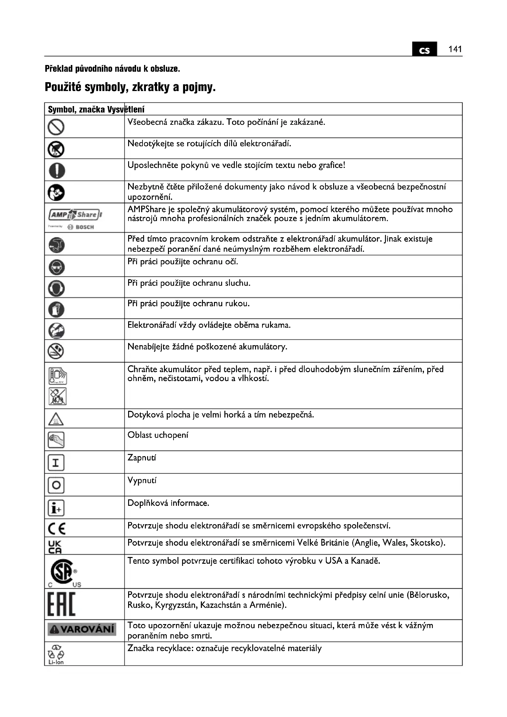 Překlad původního návodu k obsluze. Použité symboly, zkratky a pojmy. Symbol, značka Vysvětlení Všeobecná značka zákazu. Toto počínání je zakázané. Nedotýkejte se rotujících dílů elektronářadí. Uposlechněte pokynů ve vedle stojícím textu nebo grafice! Nezbytně čtěte přiložené dokumenty jako návod k obsluze a všeobecná bezpečnostní upozornění. AMPShare je společný akumulátorový systém, pomocí kterého můžete používat mnoho nástrojů mnoha profesionálních značek pouze s jedním akumulátorem. Před tímto pracovním krokem odstraňte z elektronářadí akumulátor. Jinak existuje nebezpečí poranění dané neúmyslným rozběhem elektronářadí. Při práci použijte ochranu očí. Při práci použijte ochranu sluchu. Při práci použijte ochranu rukou. Elektronářadí vždy ovládejte oběma rukama. Nenabíjejte žádné poškozené akumulátory. Chraňte akumulátor před teplem, např. i před dlouhodobým slunečním zářením, před ohněm, nečistotami, vodou a vlhkostí. Dotyková plocha je velmi horká a tím nebezpečná. Oblast uchopení Zapnutí Vypnutí Doplňková informace. Potvrzuje shodu elektronářadí se směrnicemi evropského společenství. Potvrzuje shodu elektronářadí se směrnicemi Velké Británie (Anglie, Wales, Skotsko). Tento symbol potvrzuje certifikaci tohoto výrobku v USA a Kanadě. Potvrzuje shodu elektronářadí s národními technickými předpisy celní unie (Bělorusko, Rusko, Kyrgyzstán, Kazachstán a Arménie). Toto upozornění ukazuje možnou nebezpečnou situaci, která může vést k vážným poraněním nebo smrti. Značka recyklace: označuje recyklovatelné materiály max.50°C142