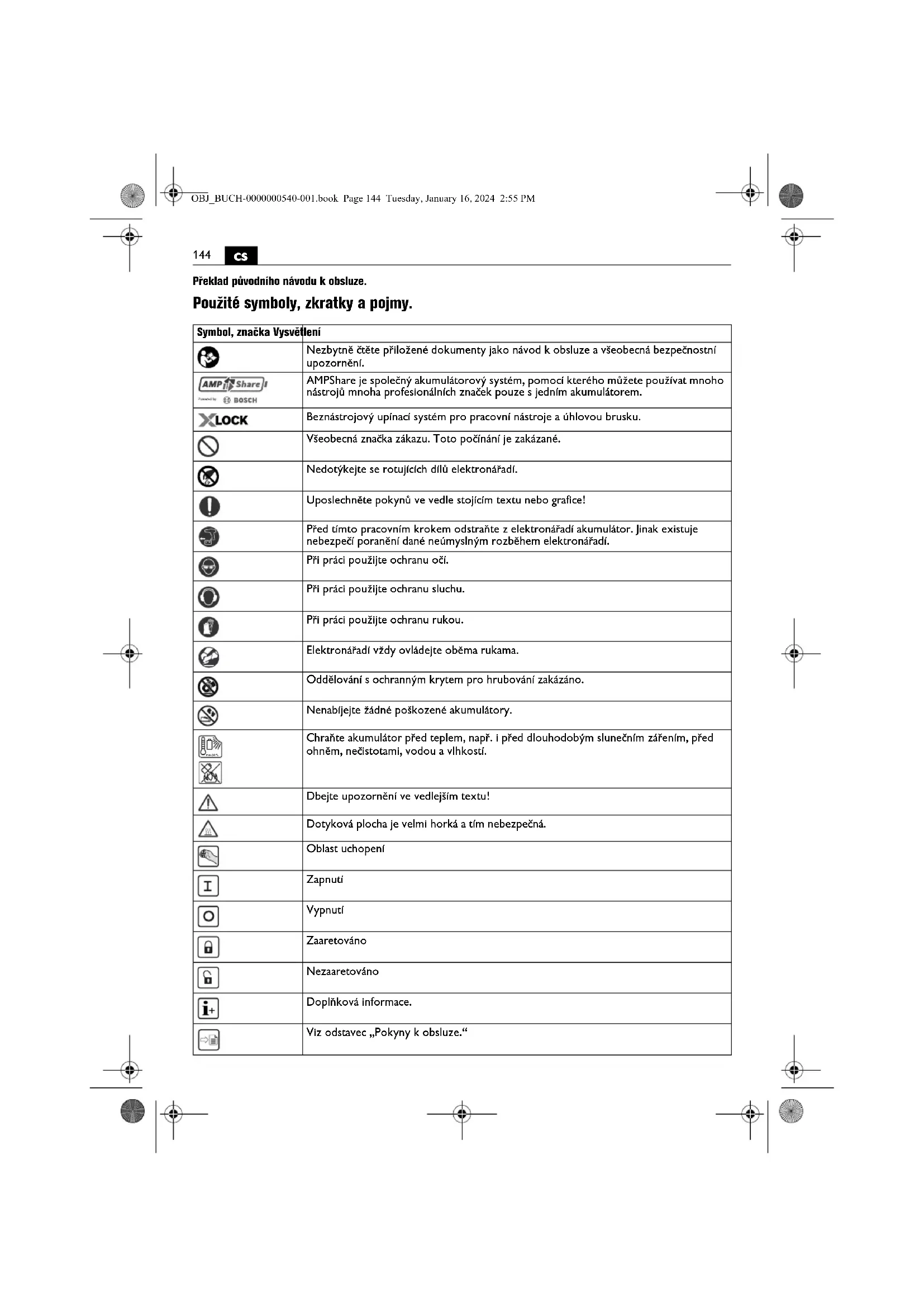 Překlad původního návodu k obsluze. Použité symboly, zkratky a pojmy. Symbol, značka Vysvětlení Nezbytně čtěte přiložené dokumenty jako návod k obsluze a všeobecná bezpečnostní upozornění. AMPShare je společný akumulátorový systém, pomocí kterého můžete používat mnoho nástrojů mnoha profesionálních značek pouze s jedním akumulátorem. Beznástrojový upínací systém pro pracovní nástroje a úhlovou brusku. Všeobecná značka zákazu. Toto počínání je zakázané. Nedotýkejte se rotujících dílů elektronářadí. Uposlechněte pokynů ve vedle stojícím textu nebo grafice! Před tímto pracovním krokem odstraňte z elektronářadí akumulátor. Jinak existuje nebezpečí poranění dané neúmyslným rozběhem elektronářadí. Při práci použijte ochranu očí. Při práci použijte ochranu sluchu. Při práci použijte ochranu rukou. Elektronářadí vždy ovládejte oběma rukama. Oddělování s ochranným krytem pro hrubování zakázáno. Nenabíjejte žádné poškozené akumulátory. Chraňte akumulátor před teplem, např. i před dlouhodobým slunečním zářením, před ohněm, nečistotami, vodou a vlhkostí. Dbejte upozornění ve vedlejším textu! Dotyková plocha je velmi horká a tím nebezpečná. Oblast uchopení Zapnutí Vypnutí Zaaretováno Nezaaretováno Doplňková informace. Viz odstavec „Pokyny k obsluze.“ max.50°C OBJ_BUCH-0000000540-001.book Page 144 Tuesday, January 16, 2024 2:55 PM145