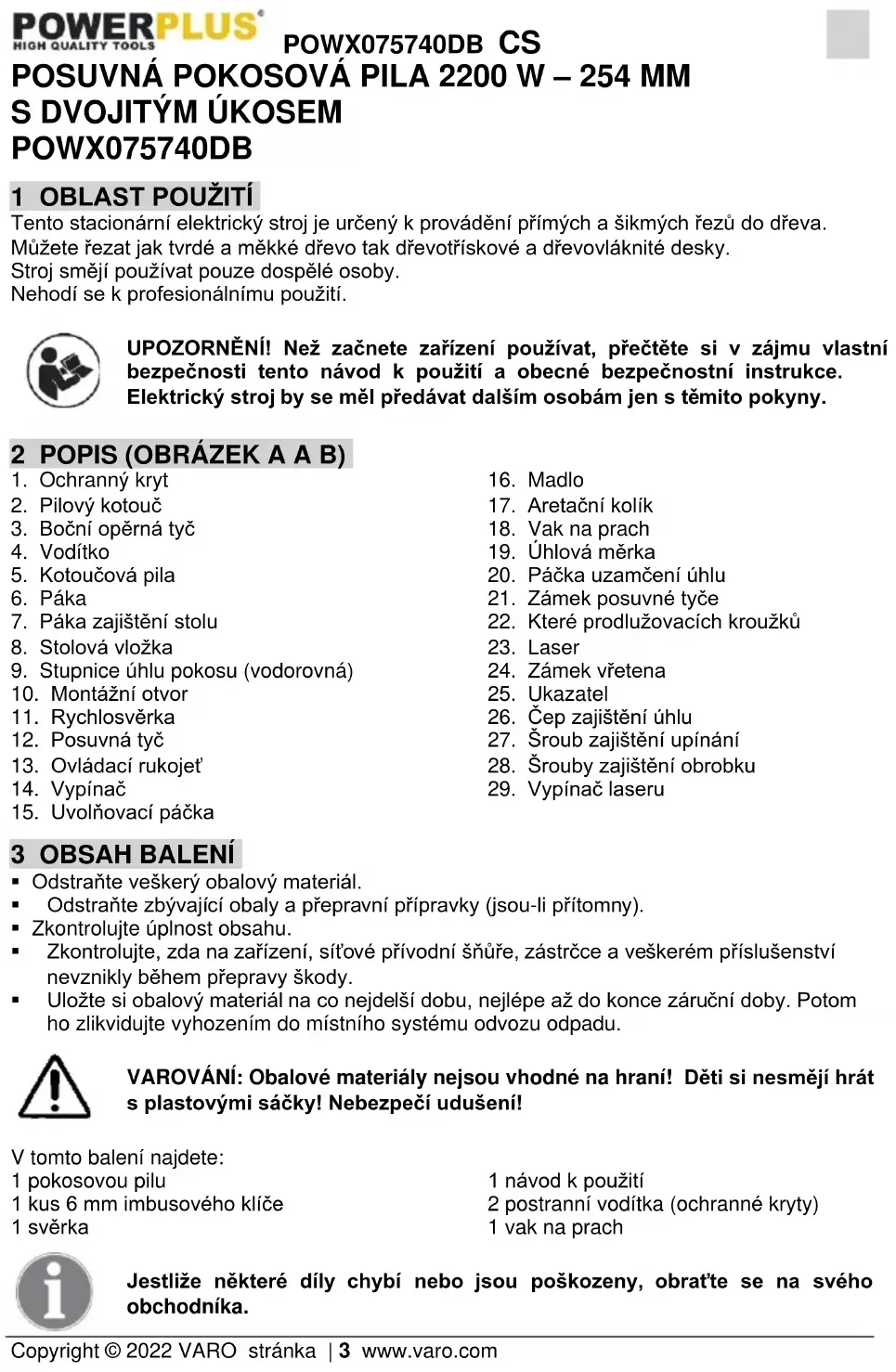 - Uložte si obalový materiál na co nejdelší dobu, nejlépe až do konce záruční doby. Potom ho zlikvidujte vyhozením do místního systému odvozu odpadu. VAROVÁNÍ: Obalové materiály nejsou vhodné na hraní! Děti si nesmějí hrát s plastovými sáčky! Nebezpečí udušení! V tomto balení najdete: 1 pokosovou pilu 1 kus 6 mm imbusového klíče 1 svěrka 1 návod k použití 2 postranní vodítka (ochranné kryty) 1 vak na prach Jestliže některé díly chybí nebo jsou poškozeny, obraťte se na svého obchodníka.POWX075740DB CS Copyright © 2022 VARO stránka | 4 www.varo.com 4 SYMBOLY V tomto návodu a na stroji jsou používány následující symboly: