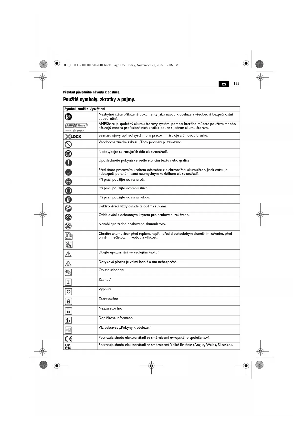 Překlad původního návodu k obsluze. Použité symboly, zkratky a pojmy. Symbol, značka Vysvětlení Nezbytně čtěte přiložené dokumenty jako návod k obsluze a všeobecná bezpečnostní upozornění. AMPShare je společný akumulátorový systém, pomocí kterého můžete používat mnoho nástrojů mnoha profesionálních značek pouze s jedním akumulátorem. Beznástrojový upínací systém pro pracovní nástroje a úhlovou brusku. Všeobecná značka zákazu. Toto počínání je zakázané. Nedotýkejte se rotujících dílů elektronářadí. Uposlechněte pokynů ve vedle stojícím textu nebo grafice! Před tímto pracovním krokem odstraňte z elektronářadí akumulátor. Jinak existuje nebezpečí poranění dané neúmyslným rozběhem elektronářadí. Při práci použijte ochranu očí. Při práci použijte ochranu sluchu. Při práci použijte ochranu rukou. Elektronářadí vždy ovládejte oběma rukama. Oddělování s ochranným krytem pro hrubování zakázáno. Nenabíjejte žádné poškozené akumulátory. Chraňte akumulátor před teplem, např. i před dlouhodobým slunečním zářením, před ohněm, nečistotami, vodou a vlhkostí. Dbejte upozornění ve vedlejším textu! Dotyková plocha je velmi horká a tím nebezpečná. Oblast uchopení Zapnutí Vypnutí Zaaretováno Nezaaretováno Doplňková informace. Viz odstavec „Pokyny k obsluze.“ Potvrzuje shodu elektronářadí se směrnicemi evropského společenství. Potvrzuje shodu elektronářadí se směrnicemi Velké Británie (Anglie, Wales, Skotsko). max.50°C OBJ_BUCH-0000000502-001.book Page 155 Friday, November 25, 2022 12:06 PM156