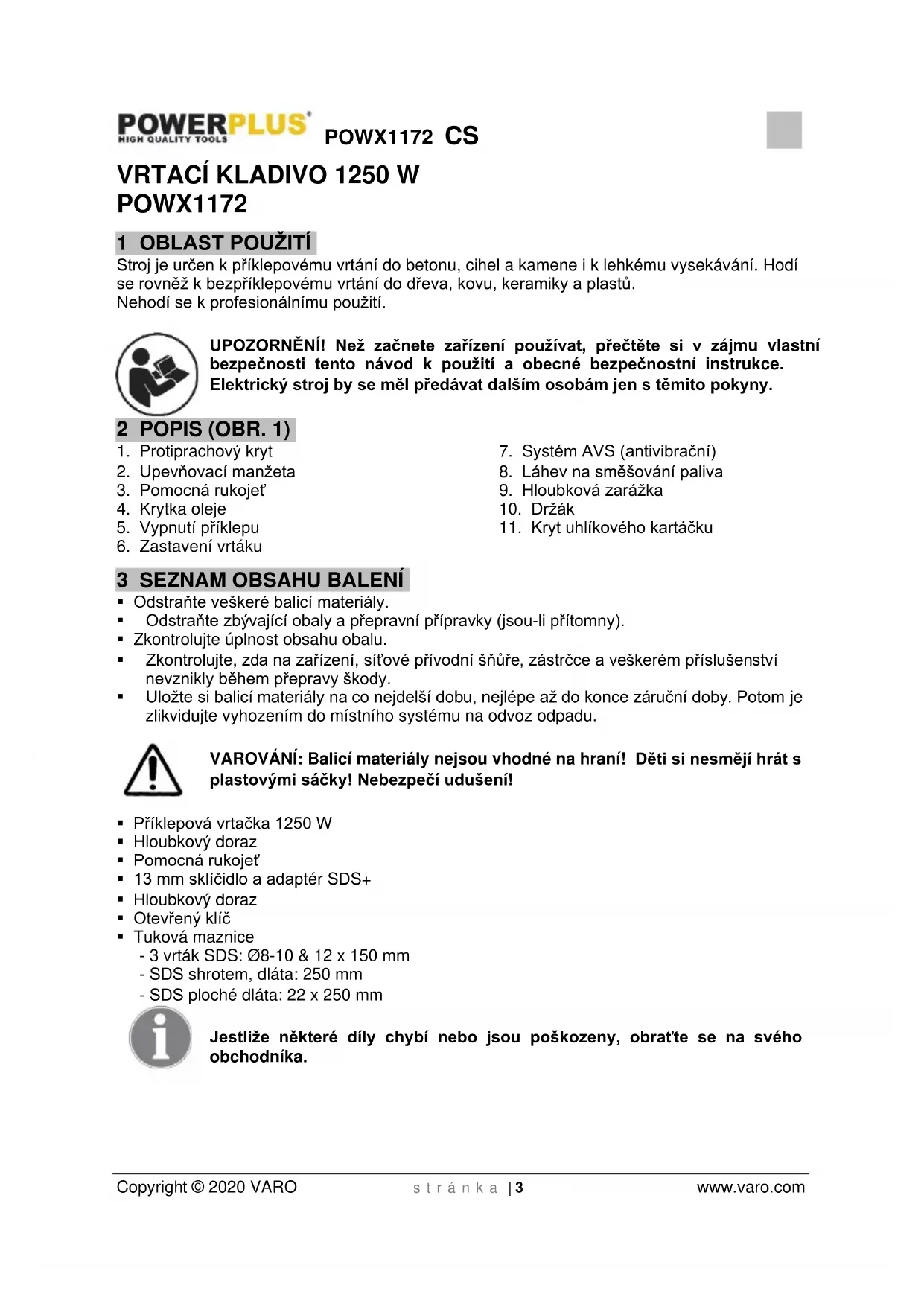 - VARO N.V. - Joseph Van Instraat 9 - BE2500 Lier - BELGIUM, prohlašuje, že Výrobek: Vrtací kladivo Výrobní značka: POWERplus Model: POWX1172 je ve shodě se základními požadavky a ostatními relevantními ustanoveními příslušných evropských směrnic založených na aplikaci evropských harmonizovaných norem. Jakákoliv neschválená úprava přístroje vede ke ztrátě platnosti tohoto prohlášení. Evropské směrnice (včetně, nastanou-li, jejich změn a doplňků až do data podpisu): 2011/65/EU 2006/42/ES 2014/30/EU Evropské harmonizované normy (včetně, nastanou-li, jejich změn a doplňků až do data podpisu): EN60745-1 : 2009 EN60745-2-6 : 2010 EN55014-1 : 2017 EN55014-2 : 2015 EN61000-3-2 : 2014 EN61000-3-11 : 2000 Držitel technické dokumentace: Philippe Vankerkhove, VARO - Vic. Van Rompuy N.V. Níže podepsaný jedná jménem vedení společnosti, Philippe Vankerkhove Regulativní postupy - Manažer pro dohled nad řádným jednáním Lier, 31/03/2020POWX1172 SK Copyright © 2020 VARO S t r a n a | 1 www.varo.com 1 POUŽÍVANIE p. 3