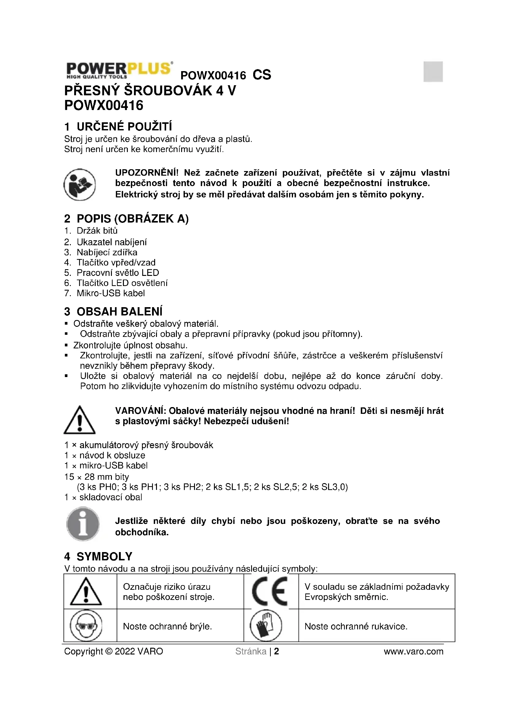 - Uložte si obalový materiál na co nejdelší dobu, nejlépe až do konce záruční doby. Potom ho zlikvidujte vyhozením do místního systému odvozu odpadu. VAROVÁNÍ: Obalové materiály nejsou vhodné na hraní! Děti si nesmějí hrát s plastovými sáčky! Nebezpečí udušení! 1 × akumulátorový přesný šroubovák 1 × návod k obsluze 1 × mikro-USB kabel 15 × 28 mm bity (3 ks PH0; 3 ks PH1; 3 ks PH2; 2 ks SL1,5; 2 ks SL2,5; 2 ks SL3,0) 1 × skladovací obal Jestliže některé díly chybí nebo jsou poškozeny, obraťte se na svého obchodníka. 4 SYMBOLY V tomto návodu a na stroji jsou používány následující symboly: