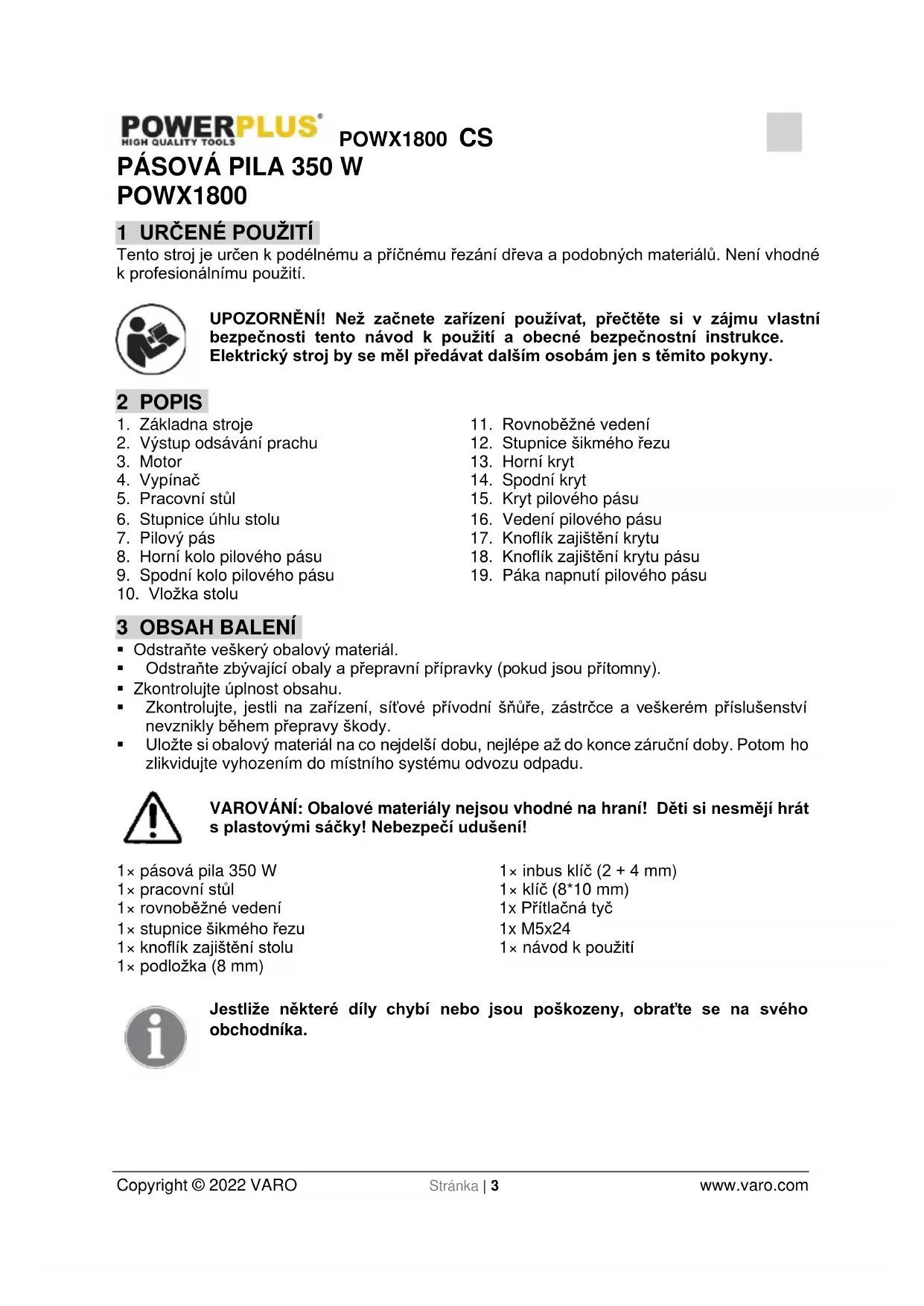 - Uložte si obalový materiál na co nejdelší dobu, nejlépe až do konce záruční doby. Potom ho zlikvidujte vyhozením do místního systému odvozu odpadu. VAROVÁNÍ: Obalové materiály nejsou vhodné na hraní! Děti si nesmějí hrát s plastovými sáčky! Nebezpečí udušení! 1× pásová pila 350 W 1× pracovní stůl 1× rovnoběžné vedení 1× stupnice šikmého řezu 1× knoflík zajištění stolu 1× podložka (8 mm) 1× inbus klíč (2 + 4 mm) 1× klíč (8*10 mm) 1x Přítlačná tyč 1x M5x24 1× návod k použití Jestliže některé díly chybí nebo jsou poškozeny, obraťte se na svého obchodníka.POWX1800 CS Copyright © 2022 VARO Stránka | 4 www.varo.com 4 SYMBOLY V tomto návodu a na stroji jsou používány následující symboly: