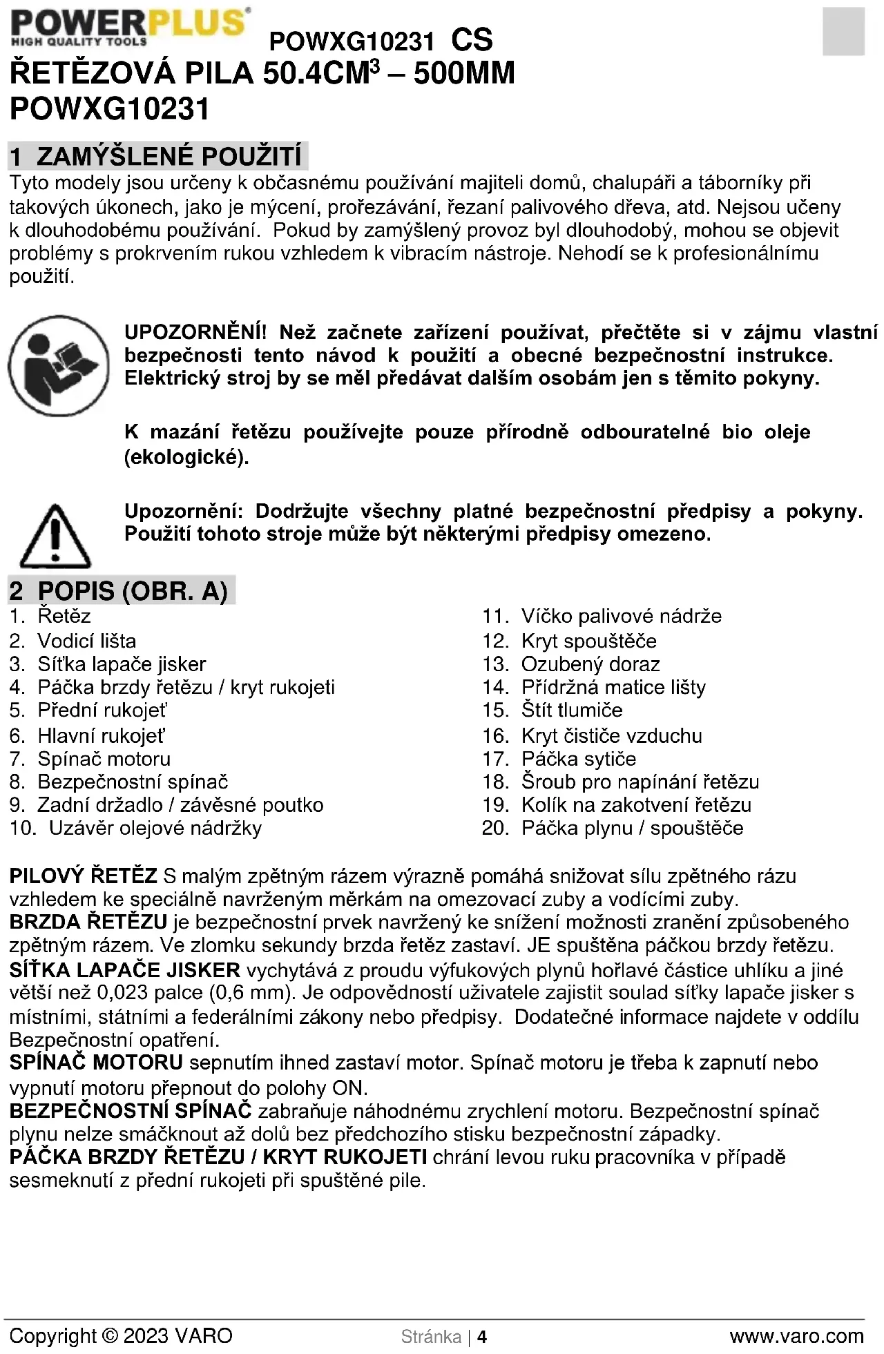 PILOVÝ ŘETĚZ S malým zpětným rázem výrazně pomáhá snižovat sílu zpětného rázu vzhledem ke speciálně navrženým měrkám na omezovací zuby a vodícími zuby. BRZDA ŘETĚZU je bezpečnostní prvek navržený ke snížení možnosti zranění způsobeného zpětným rázem. Ve zlomku sekundy brzda řetěz zastaví. JE spuštěna páčkou brzdy řetězu. SÍŤKA LAPAČE JISKER vychytává z proudu výfukových plynů hořlavé částice uhlíku a jiné větší než 0,023 palce (0,6 mm). Je odpovědností uživatele zajistit soulad síťky lapače jisker s místními, státními a federálními zákony nebo předpisy. Dodatečné informace najdete v oddílu Bezpečnostní opatření. SPÍNAČ MOTORU sepnutím ihned zastaví motor. Spínač motoru je třeba k zapnutí nebo vypnutí motoru přepnout do polohy ON. BEZPEČNOSTNÍ SPÍNAČ zabraňuje náhodnému zrychlení motoru. Bezpečnostní spínač plynu nelze smáčknout až dolů bez předchozího stisku bezpečnostní západky. PÁČKA BRZDY ŘETĚZU / KRYT RUKOJETI chrání levou ruku pracovníka v případě sesmeknutí z přední rukojeti při spuštěné pile.POWXG10231 CS Copyright © 2023 VARO Stránka | 5 www.varo.com ZACHYTÁVAČ ŘETĚZU snižuje nebezpečí zranění v případě prasknutí nebo vykolejení řetězu při provozu. Zachytávač řetězu je určen k zadržení švihajícího řetězu. POZNÁMKA: Pilu řádně prohlédněte a seznamte se s jejími částmi. VAROVÁNÍ: Buďte velmi opatrní na zpětný ráz. Při používání držte řetězovou pilu pevně oběma rukama. Z důvodu vlastní bezpečnosti si ještě před prvním spuštěním řetězové pily přečtěte bezpečnostními pokyny v tomto návodu a také se jimi řiďte. Nesprávné používání může způsobit vážné zranění. VAROVÁNÍ! Používáte-li skleněné brýle, je nutné se vždy řídit základními bezpečnostními opatřeními včetně následujících, které sníží riziko vážného poranění osob nebo poškození přístroje.