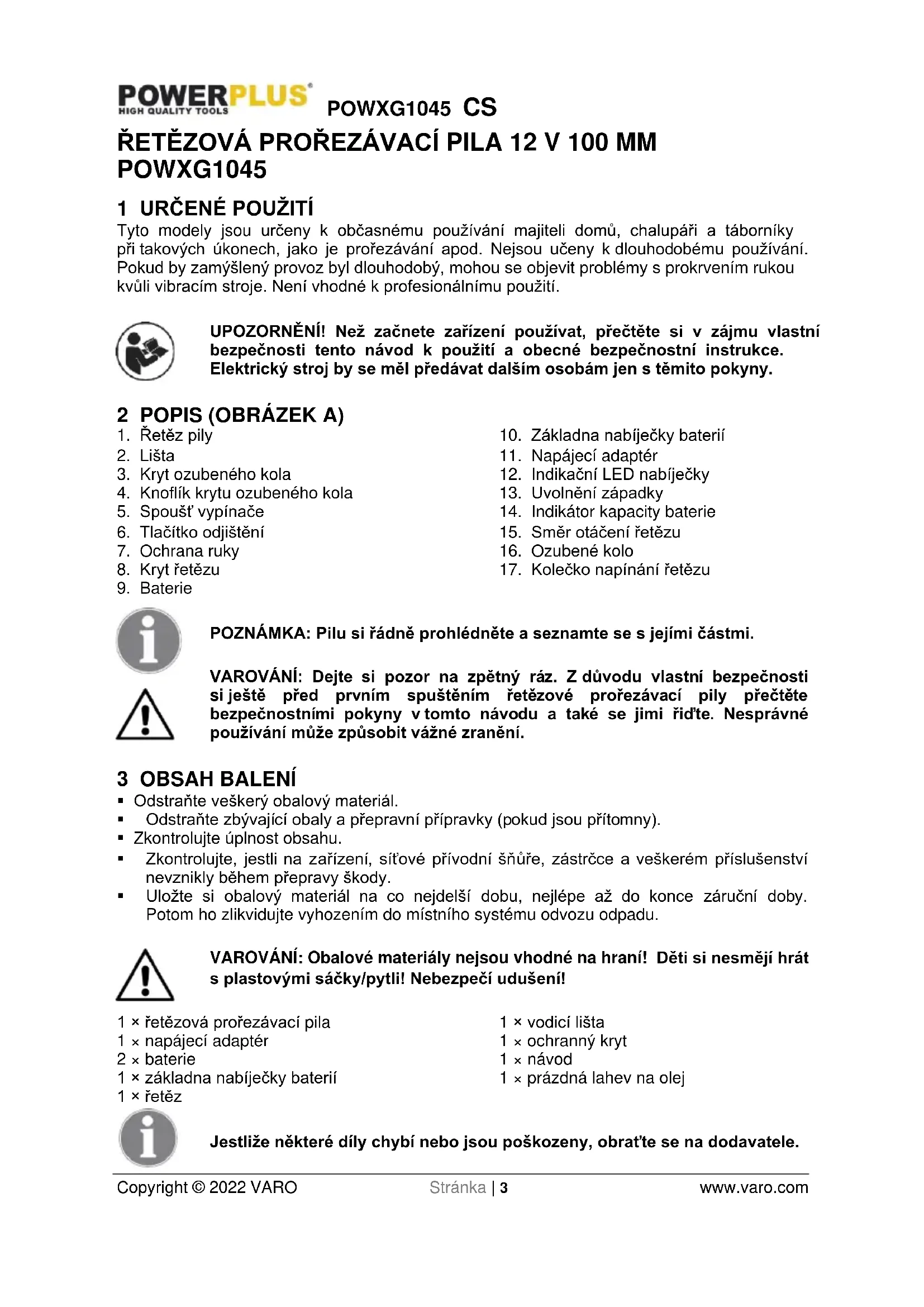 - Na vodicí liště a řetězu nikdy nešetřete olejem. Řezání pilou na sucho, nebo s příliš malým množstvím oleje, je méně účinné, životnost pilového řetězu se zkracuje, řetěz se rychle otupí a vodicí lišta se nadměrně opotřebovává v důsledku přehřívání. Příliš málo oleje se projevuje kouřem nebo změnou barvy vodicí lišty. 14 TECHNICKÉ ÚDAJE Model POWXG1045 Napětí 12 V Délka lišty 100 mm Řezná délka lišty 90 mm Rozteč řetězu 7,6 mm (0,30") Tloušťka vodicího článku řetězu 1,1 mm (0 043") Hnací ozubené kolo 7 zubůPOWXG1045 CS Copyright © 2022 VARO Stránka | 12 www.varo.com 15 HLUK Hodnoty emisí hluku se měří podle příslušné normy. (K=3) Úroveň akustického tlaku LpA 78 dB(A) Úroveň akustického výkonu LwA 86 dB(A) POZOR! Když hladina akustického tlaku přesáhne 85 dB(A), použijte ochranu sluchu. aw (Vibrace) 2,6 m/s² K = 1,5 m/s² 16 ZÁRUKA