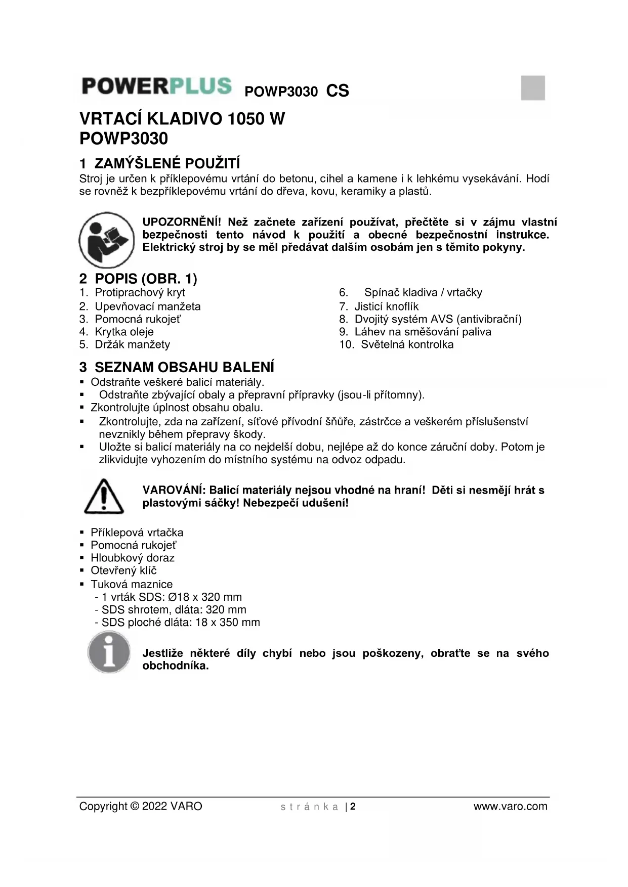 - Uložte jej mimo dosah dětí do stabilní a bezpečné polohy na chladném a suchém místě; vyhýbejte se příliš vysokým i příliš nízkým teplotám.POWP3030 CS Copyright © 2022 VARO s t r á n k a | 8 www.varo.com
