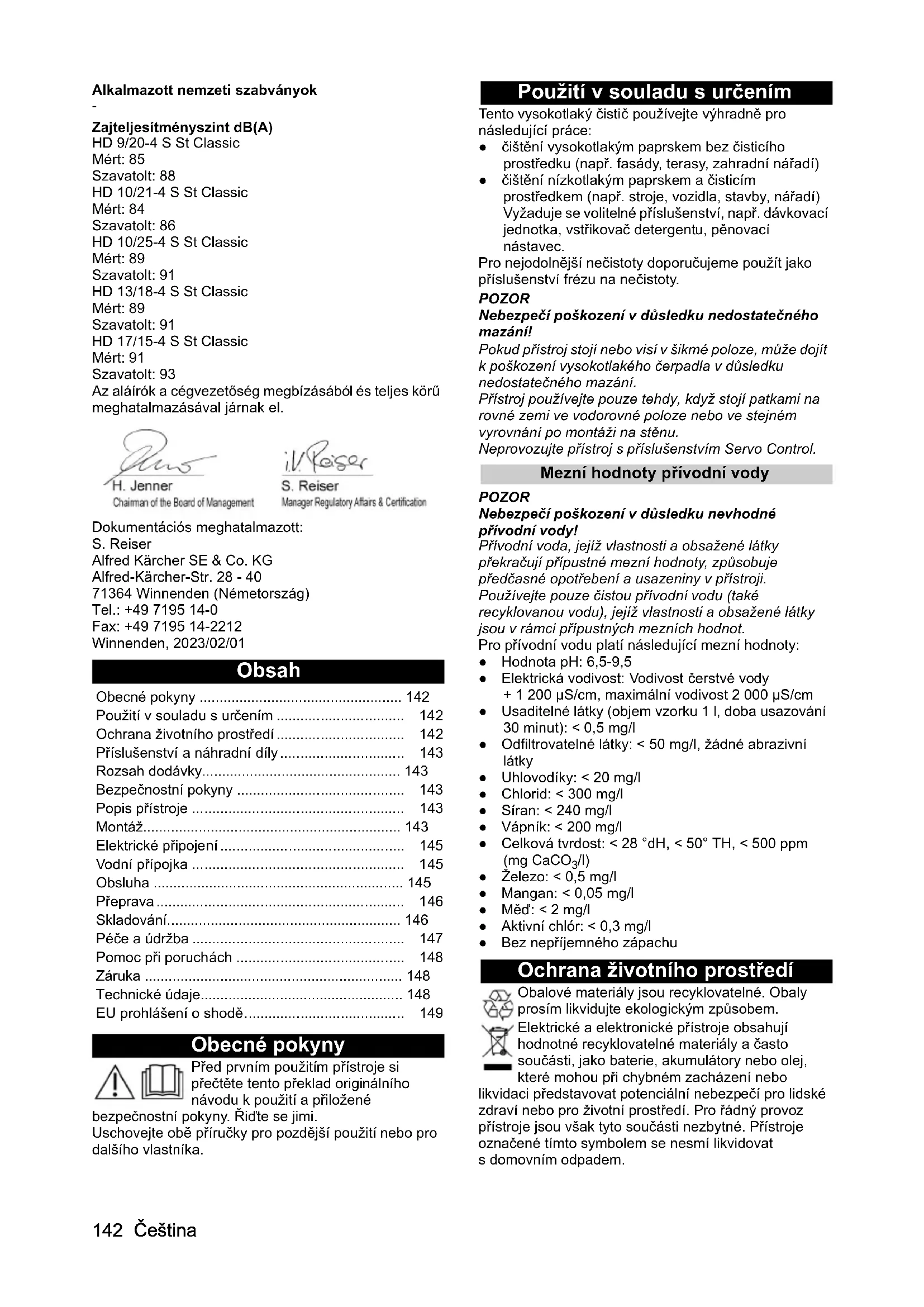 Zajteljesítményszint dB(A) HD 9/20-4 S St Classic Mért: 85 Szavatolt: 88 HD 10/21-4 S St Classic Mért: 84 Szavatolt: 86 HD 10/25-4 S St Classic Mért: 89 Szavatolt: 91 HD 13/18-4 S St Classic Mért: 89 Szavatolt: 91 HD 17/15-4 S St Classic Mért: 91 Szavatolt: 93 Az aláírók a cégvezetőség megbízásából és teljes körű meghatalmazásával járnak el. Dokumentációs meghatalmazott: S. Reiser Alfred Kärcher SE & Co. KG Alfred-Kärcher-Str. 28 - 40 71364 Winnenden (Németország) Tel.: +49 7195 14-0 Fax: +49 7195 14-2212 Winnenden, 2023/02/01 Obsah Obecné pokyny Před prvním použitím přístroje si přečtěte tento překlad originálního návodu k použití a přiložené bezpečnostní pokyny. Řiďte se jimi. Uschovejte obě příručky pro pozdější použití nebo pro dalšího vlastníka. Použití v souladu s určením Tento vysokotlaký čistič používejte výhradně pro následující práce: ●čištění vysokotlakým paprskem bez čisticího prostředku (např. fasády, terasy, zahradní nářadí) ●čištění nízkotlakým paprskem a čisticím prostředkem (např. stroje, vozidla, stavby, nářadí) Vyžaduje se volitelné příslušenství, např. dávkovací jednotka, vstřikovač detergentu, pěnovací nástavec. Pro nejodolnější nečistoty doporučujeme použít jako příslušenství frézu na nečistoty. POZOR Nebezpečí poškození v důsledku nedostatečného mazání! Pokud přístroj stojí nebo visí v šikmé poloze, může dojít k poškození vysokotlakého čerpadla v důsledku nedostatečného mazání. Přístroj používejte pouze tehdy, když stojí patkami na rovné zemi ve vodorovné poloze nebo ve stejném vyrovnání po montáži na stěnu. Neprovozujte přístroj s příslušenstvím Servo Control. Mezní hodnoty přívodní vody POZOR Nebezpečí poškození v důsledku nevhodné přívodní vody! Přívodní voda, jejíž vlastnosti a obsažené látky překračují přípustné mezní hodnoty, způsobuje předčasné opotřebení a usazeniny v přístroji. Používejte pouze čistou přívodní vodu (také recyklovanou vodu), jejíž vlastnosti a obsažené látky jsou v rámci přípustných mezních hodnot. Pro přívodní vodu platí následující mezní hodnoty: ● Hodnota pH: 6,5-9,5 ● Elektrická vodivost: Vodivost čerstvé vody + 1 200 µS/cm, maximální vodivost 2 000 µS/cm ● Usaditelné látky (objem vzorku 1 l, doba usazování 30 minut): < 0,5 mg/l ● Odfiltrovatelné látky: < 50 mg/l, žádné abrazivní látky ● Uhlovodíky: < 20 mg/l ● Chlorid: < 300 mg/l ● Síran: < 240 mg/l ● Vápník: < 200 mg/l ● Celková tvrdost: < 28 °dH, < 50° TH, < 500 ppm (mg CaCO