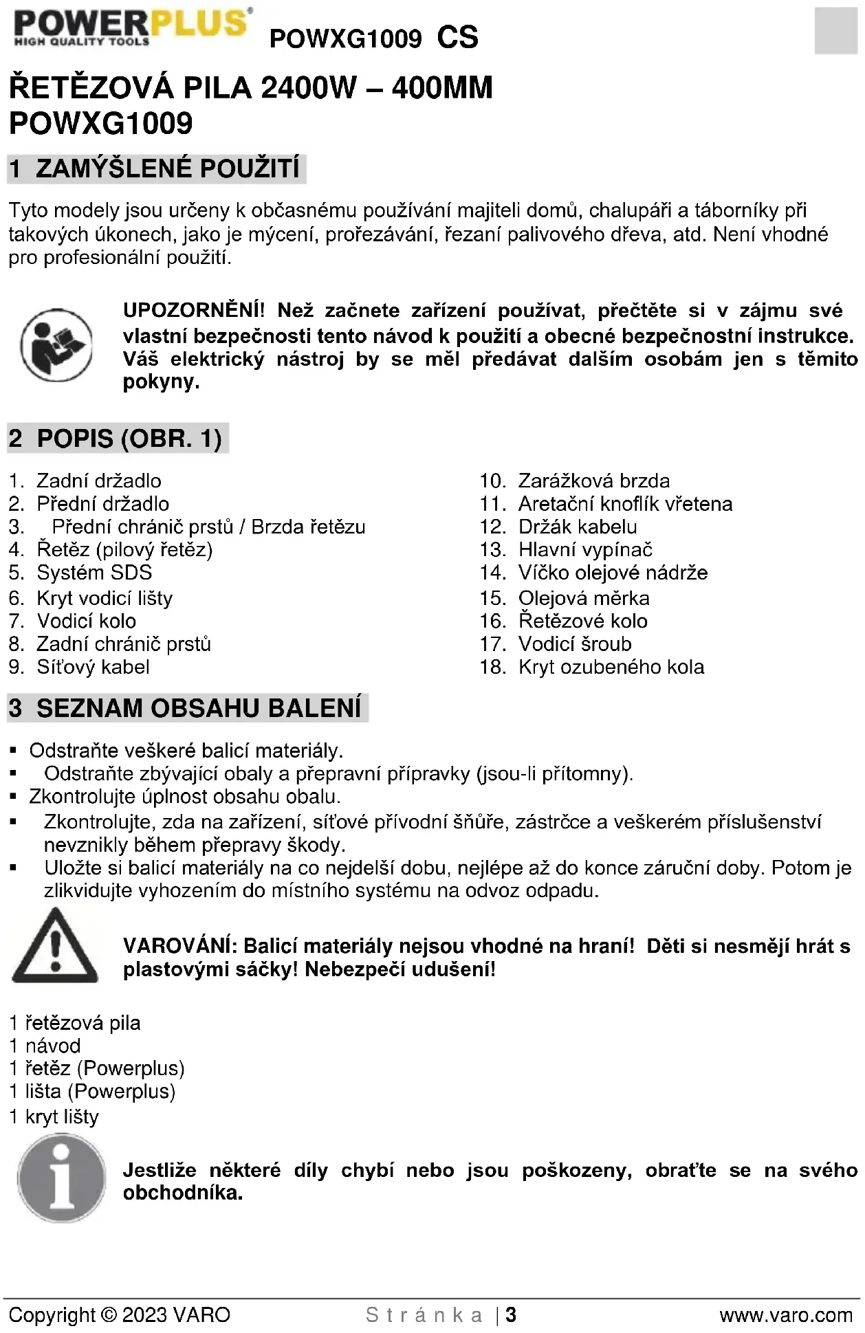 - Na svahu vždy pracujte tváří do kopce.POWXG1009 CS Copyright © 2023 VARO S t r á n k a | 6 www.varo.com