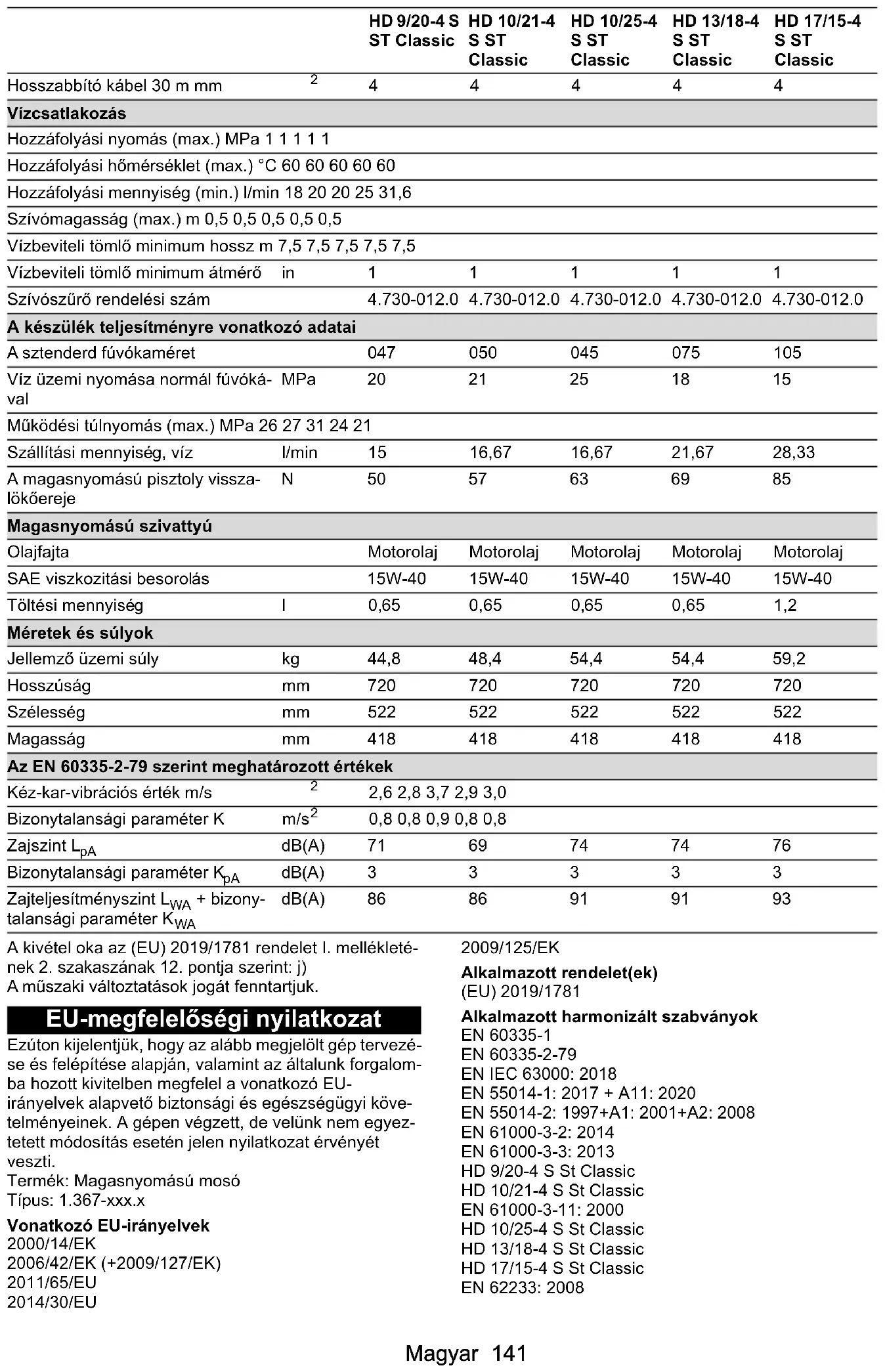 44444Čeština 149 Důvod výjimky podle nařízení (EU) 2019/1781, příloha I, oddíl 2 (12): j) Technické změny vyhrazeny. EU prohlášení o shodě Prohlašujeme tímto, že níže uvedený stroj na základě svého provedení a druhu konstrukce, jakož i v provedení námi uváděném na trh, vyhovuje příslušným základním bezpečnostním a zdravotním požadavkům podle směrnic EU. V případě provedení námi neschválené změny stroje ztrácí toto prohlášení svoji platnost. Výrobek: Vysokotlaký čistič Typ: 1.367-xxx.x Příslušné směrnice EU 2000/14/ES 2006/42/ES (+2009/127/ES) 2011/65/EU 2014/30/EU 2009/125/ES Aplikované(á) nařízení (EU) 2019/1781 Aplikované harmonizované normy EN 60335-1 EN 60335-2-79 EN IEC 63000: 2018 EN 55014-1: 2017 + A11: 2020 EN 55014-2: 1997+A1: 2001+A2: 2008 EN 61000-3-2: 2014 EN 61000-3-3: 2013 HD 9/20-4 S St Classic HD 10/21-4 S St Classic EN 61000-3-11: 2000 HD 10/25-4 S St Classic HD 13/18-4 S St Classic HD 17/15-4 S St Classic EN 62233: 2008 Vodní přípojka Přívodní tlak (max.) MPa 1 1 1 1 1 Vstupní teplota (max.) °C 60 60 60 60 60 Vstupní množství (min.) l/min 18 20 20 25 31,6 Sací výška (max.) m 0,5 0,5 0,5 0,5 0,5 Minimální délka hadice pro přívod vody m 7,5 7,5 7,5 7,5 7,5 Minimální průměr hadice pro přívod vody in11111 Objednací číslo sacího filtru 4.730-012.0 4.730-012.0 4.730-012.0 4.730-012.0 4.730-012.0 Výkonnostní údaje přístroje Velikost standardní trysky 047 050 045 075 105 Provozní tlak vody se standardní tryskou MPa2021251815 Provozní přetlak (max.) MPa 26 27 31 24 21 Čerpané množství, voda l/min 15 16,67 16,67 21,67 28,33 Reaktivní síla vysokotlaké pistole N 50 57 63 69 85 Vysokotlaké čerpadlo Druh oleje Motorový olej Motorový olej Motorový olej Motorový olej Motorový olej Viskozitní třída SAE 15W-40 15W-40 15W-40 15W-40 15W-40 Plnicí množství l 0,65 0,65 0,65 0,65 1,2 Rozměry a hmotnosti Typická provozní hmotnost kg 44,8 48,4 54,4 54,4 59,2 Délka mm 720 720 720 720 720 Šířka mm 522 522 522 522 522 Výška mm 418 418 418 418 418 Zjištěné hodnoty podle EN 60335-2-79 Hodnota vibrací rukou/paží m/s