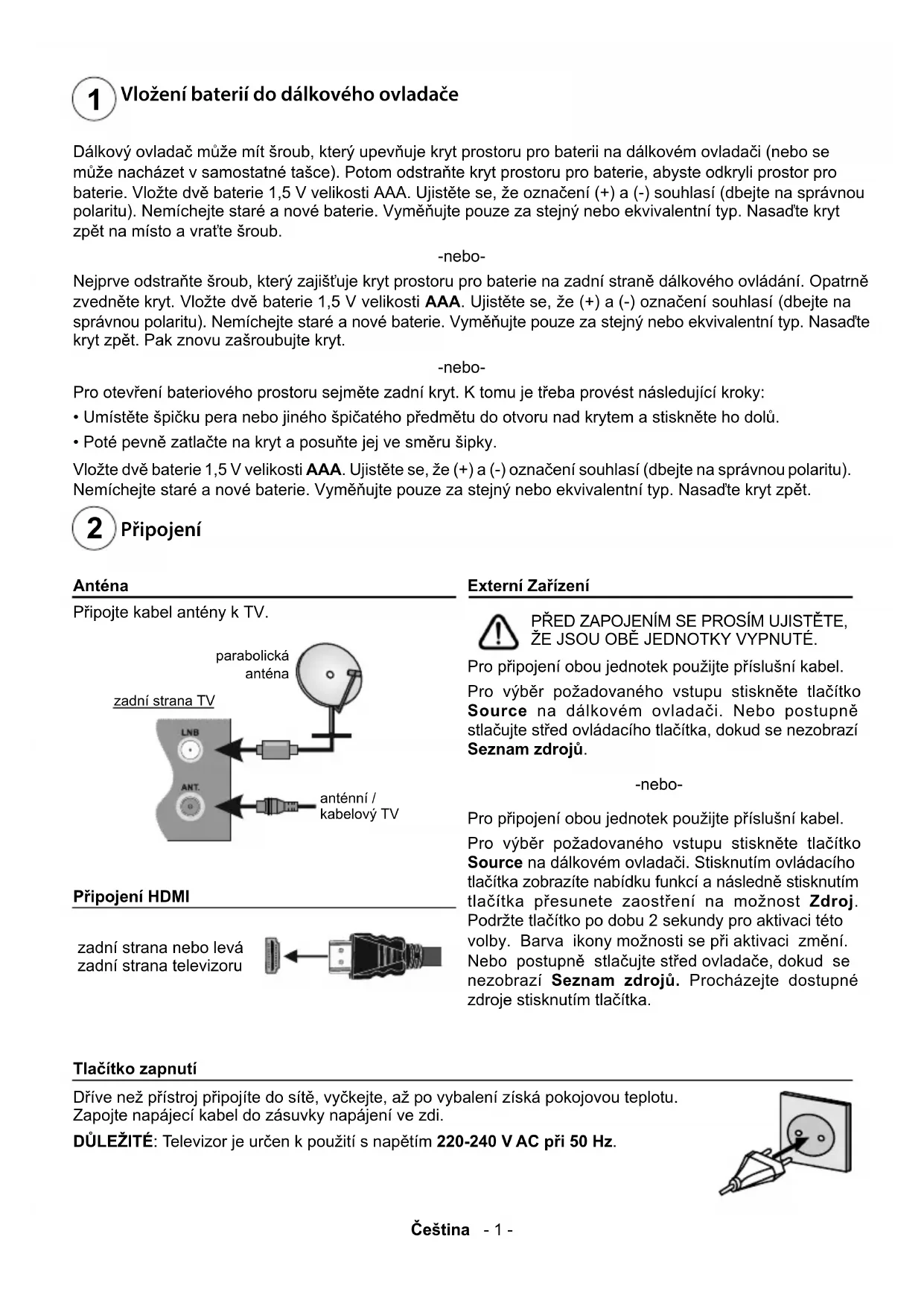 Připojení Anténa Připojte kabel antény k TV. parabolická anténa anténní / kabelový TV zadní strana TV Připojení HDMI zadní strana nebo levá zadní strana televizoru Externí Zařízení PŘED ZAPOJENÍM SE PROSÍM UJISTĚTE, ŽE JSOU OBĚ JEDNOTKY VYPNUTÉ. Pro připojení obou jednotek použijte příslušní kabel. Pro výběr požadovaného vstupu stiskněte tlačítko Source na dálkovém ovladači. Nebo postupně stlačujte střed ovládacího tlačítka, dokud se nezobrazí Seznam zdrojů. -nebo- Pro připojení obou jednotek použijte příslušní kabel. Pro výběr požadovaného vstupu stiskněte tlačítko Source na dálkovém ovladači. Stisknutím ovládacího tlačítka zobrazíte nabídku funkcí a následně stisknutím tlačítka přesunete zaostření na možnost Zdroj. Podržte tlačítko po dobu 2 sekundy pro aktivaci této volby. Barva ikony možnosti se při aktivaci změní. Nebo postupně stlačujte střed ovladače, dokud se nezobrazí Seznam zdrojů. Procházejte dostupné zdroje stisknutím tlačítka. Tlačítko zapnutí Dříve než přístroj připojíte do sítě, vyčkejte, až po vybalení získá pokojovou teplotu. Zapojte napájecí kabel do zásuvky napájení ve zdi. DŮLEŽITÉ: Televizor je určen k použití s napětím 220-240 V AC při 50 Hz.Čeština - 2 - Zapnutí televizoru