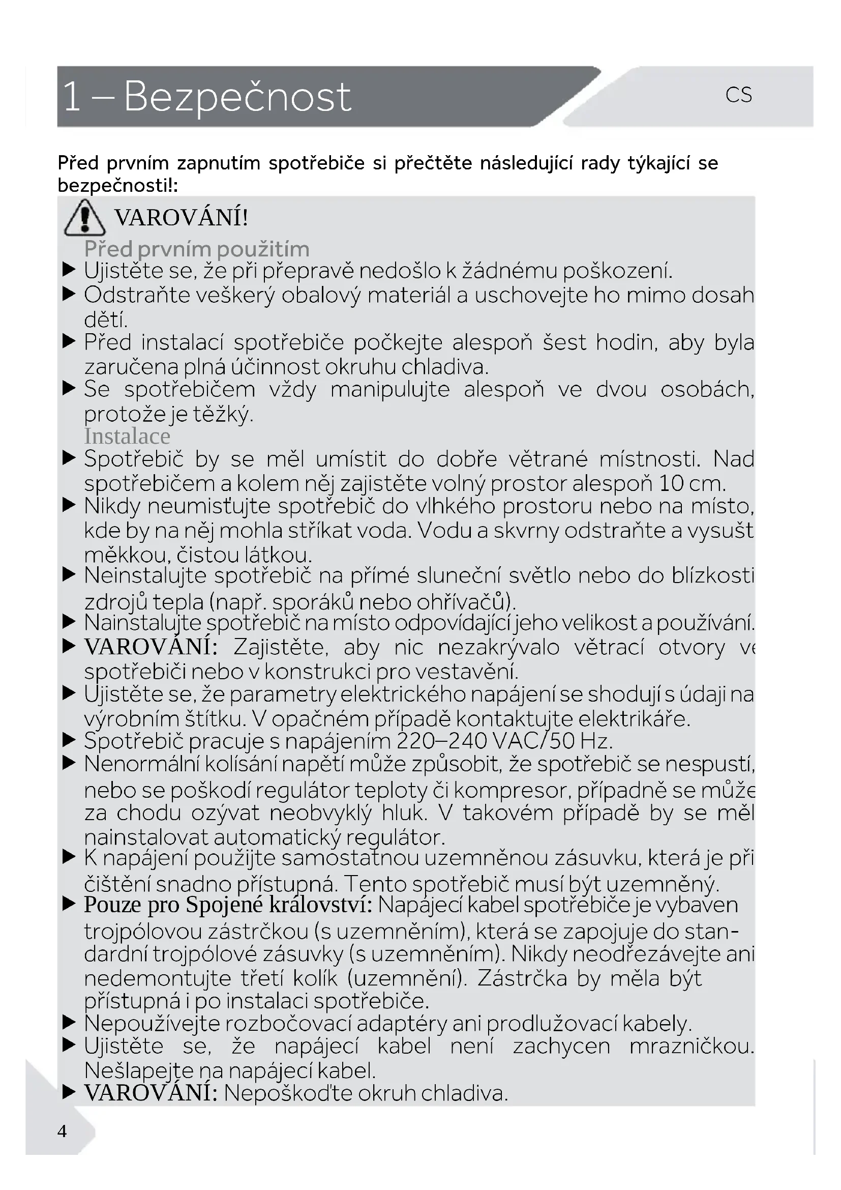 VAROVÁNÍ! Před prvním použitím Ujistěte se, že při přepravě nedošlo k žádnému poškození. Odstraňte veškerý obalový materiál a uschovejte ho mimo dosah dětí. Před instalací spotřebiče počkejte alespoň šest hodin, aby byla zaručena plná účinnost okruhu chladiva. Se spotřebičem vždy manipulujte alespoň ve dvou osobách, protože je těžký. Instalace Spotřebič by se měl umístit do dobře větrané místnosti. Nad spotřebičem a kolem něj zajistěte volný prostor alespoň 10 cm. Nikdy neumisťujte spotřebič do vlhkého prostoru nebo na místo, kde by na něj mohla stříkat voda. Vodu a skvrny odstraňte a vysušte měkkou, čistou látkou. Neinstalujte spotřebič na přímé sluneční světlo nebo do blízkosti zdrojů tepla (např. sporáků nebo ohřívačů). Nainstalujte spotřebič na místo odpovídající jeho velikost a používání. VAROVÁNÍ: Zajistěte, aby nic nezakrývalo větrací otvory ve spotřebiči nebo v konstrukci pro vestavění. Ujistěte se, že parametry elektrického napájení se shodují s údaji na výrobním štítku. V opačném případě kontaktujte elektrikáře. Spotřebič pracuje s napájením 220–240 VAC/50 Hz. Nenormální kolísání napětí může způsobit, že spotřebič se nespustí, nebo se poškodí regulátor teploty či kompresor, případně se může za chodu ozývat neobvyklý hluk. V takovém případě by se měl nainstalovat automatický regulátor. K napájení použijte samostatnou uzemněnou zásuvku, která je při čištění snadno přístupná. Tento spotřebič musí být uzemněný. Pouze pro Spojené království: Napájecí kabel spotřebiče je vybaven trojpólovou zástrčkou (s uzemněním), která se zapojuje do stan- dardní trojpólové zásuvky (s uzemněním). Nikdy neodřezávejte ani nedemontujte třetí kolík (uzemnění). Zástrčka by měla být přístupná i po instalaci spotřebiče. Nepoužívejte rozbočovací adaptéry ani prodlužovací kabely. Ujistěte se, že napájecí kabel není zachycen mrazničkou. Nešlapejte na napájecí kabel. VAROVÁNÍ: Nepoškoďte okruh chladiva.CS 1 – Bezpečnost