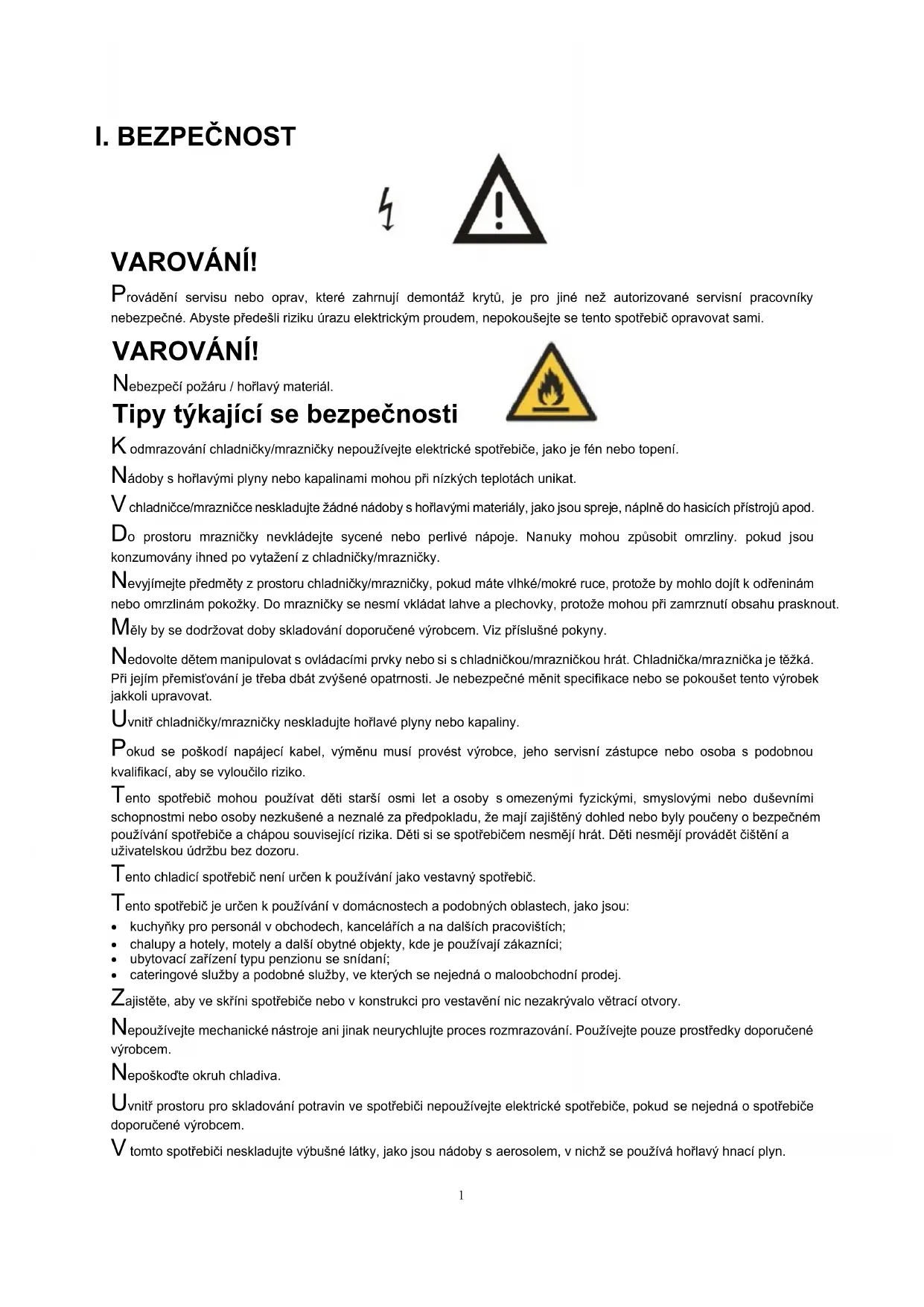 VAROVÁNÍ! Provádění servisu nebo oprav, které zahrnují demontáž krytů, je pro jiné než autorizované servisní pracovníky nebezpečné. Abyste předešli riziku úrazu elektrickým proudem, nepokoušejte se tento spotřebič opravovat sami. VAROVÁNÍ! Nebezpečí požáru / hořlavý materiál. Tipy týkající se bezpečnosti K odmrazování chladničky/mrazničky nepoužívejte elektrické spotřebiče, jako je fén nebo topení. Nádoby s hořlavými plyny nebo kapalinami mohou při nízkých teplotách unikat. V chladničce/mrazničce neskladujte žádné nádoby s hořlavými materiály, jako jsou spreje, náplně do hasicích přístrojů apod. Do prostoru mrazničky nevkládejte sycené nebo perlivé nápoje. Nanuky mohou způsobit omrzliny. pokud jsou konzumovány ihned po vytažení z chladničky/mrazničky. Nevyjímejte předměty z prostoru chladničky/mrazničky, pokud máte vlhké/mokré ruce, protože by mohlo dojít k odřeninám nebo omrzlinám pokožky. Do mrazničky se nesmí vkládat lahve a plechovky, protože mohou při zamrznutí obsahu prasknout. Měly by se dodržovat doby skladování doporučené výrobcem. Viz příslušné pokyny. Nedovolte dětem manipulovat s ovládacími prvky nebo si s chladničkou/mrazničkou hrát. Chladnička/mraznička je těžká. Při jejím přemisťování je třeba dbát zvýšené opatrnosti. Je nebezpečné měnit specifikace nebo se pokoušet tento výrobek jakkoli upravovat. Uvnitř chladničky/mrazničky neskladujte hořlavé plyny nebo kapaliny. Pokud se poškodí napájecí kabel, výměnu musí provést výrobce, jeho servisní zástupce nebo osoba s podobnou kvalifikací, aby se vyloučilo riziko. Tento spotřebič mohou používat děti starší osmi let a osoby s omezenými fyzickými, smyslovými nebo duševními schopnostmi nebo osoby nezkušené a neznalé za předpokladu, že mají zajištěný dohled nebo byly poučeny o bezpečném používání spotřebiče a chápou související rizika. Děti si se spotřebičem nesmějí hrát. Děti nesmějí provádět čištění a uživatelskou údržbu bez dozoru. Tento chladicí spotřebič není určen k používání jako vestavný spotřebič. Tento spotřebič je určen k používání v domácnostech a podobných oblastech, jako jsou: