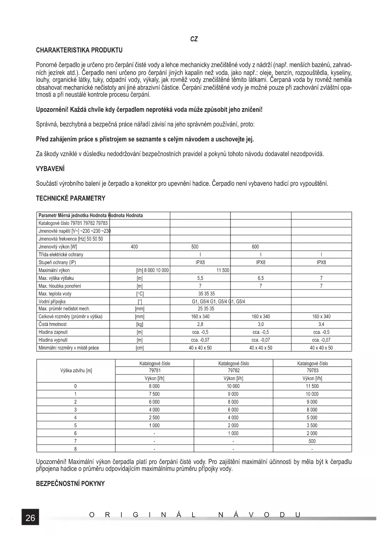CHARAKTERISTIKA PRODUKTU Ponorné čerpadlo je určeno pro čerpání čisté vody a lehce mechanicky znečištěné vody z nádrží (např. menších bazénů, zahrad- ních jezírek atd.). Čerpadlo není určeno pro čerpání jiných kapalin než voda, jako např.: oleje, benzín, rozpouštědla, kyseliny, louhy, organické látky, tuky, odpadní vody, výkaly, jak rovněž vody znečištěné těmito látkami. Čerpaná voda by rovněž neměla obsahovat mechanické nečistoty ani jiné abrazivní částice. Čerpání znečištěné vody je možné pouze při zachování zvláštní opa- trnosti a při neustálé kontrole procesu čerpání. Upozornění! Každá chvíle kdy čerpadlem neprotéká voda může způsobit jeho zničení! Správná, bezchybná a bezpečná práce nářadí závisí na jeho správném používání, proto: Před zahájením práce s přístrojem se seznamte s celým návodem a uschovejte jej. Za škody vzniklé v důsledku nedodržování bezpečnostních pravidel a pokynů tohoto návodu dodavatel nezodpovídá. VYBAVENÍ Součástí výrobního balení je čerpadlo a konektor pro upevnění hadice. Čerpadlo není vybaveno hadicí pro vypouštění. TECHNICKÉ PARAMETRY Parametr Měrná jednotka Hodnota Hodnota Hodnota Katalogové číslo 79781 79782 79783 Jmenovité napětí [V~] ~230 ~230 ~230 Jmenovitá frekvence [Hz] 50 50 50 Jmenovitý výkon [W] 400 500 600 Třída elektrické ochrany I I I Stupeň ochrany (IP) IPX8 IPX8 IPX8 Maximální výkon [l/h] 8 000 10 000 11 500 Max. výška výtlaku [m] 5,5 6,5 7 Max. hloubka ponoření [m] 7 7 7 Max. teplota vody [