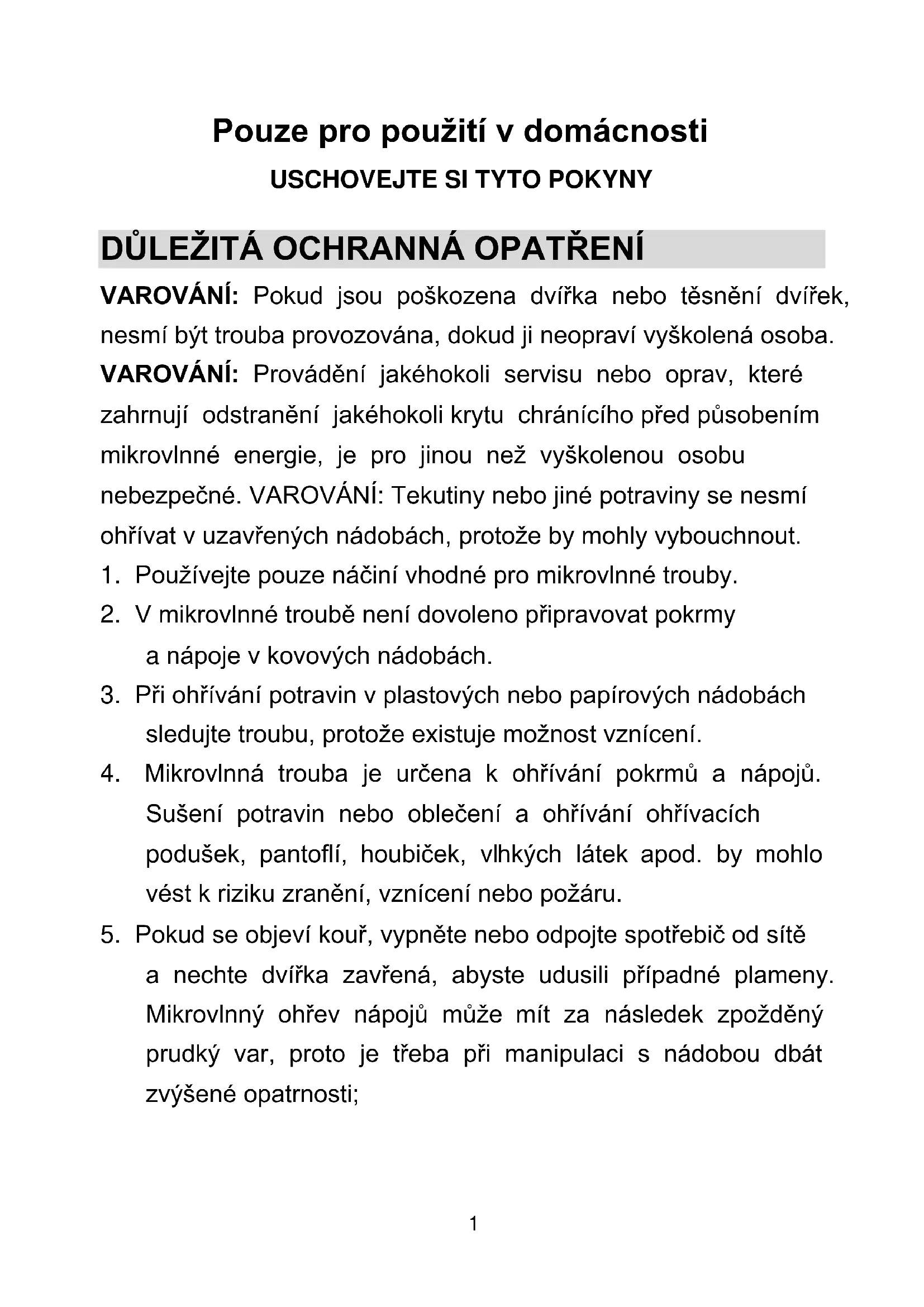 VAROVÁNÍ: Pokud jsou poškozena dvířka nebo těsnění dvířek, nesmí být trouba provozována, dokud ji neopraví vyškolená osoba. VAROVÁNÍ: Provádění jakéhokoli servisu nebo oprav, které zahrnují odstranění jakéhokoli krytu chránícího před působením mikrovlnné energie, je pro jinou než vyškolenou osobu nebezpečné. VAROVÁNÍ: Tekutiny nebo jiné potraviny se nesmí ohřívat v uzavřených nádobách, protože by mohly vybouchnout.