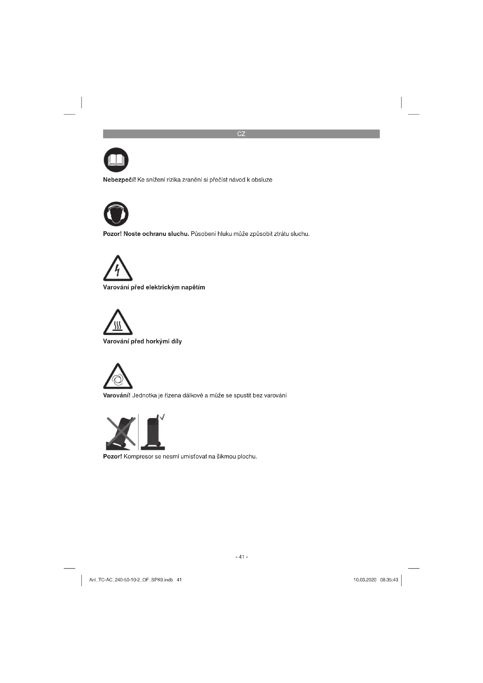 Varování před elektrickým napětím Varování před horkými díly Varování! Jednotka je řízena dálkově a může se spustit bez varování Pozor! Noste ochranu sluchu. Působení hluku může způsobit ztrátu sluchu. Nebezpečí! Ke snížení rizika zranění si přečíst návod k obsluze Pozor! Kompresor se nesmí umisťovat na šikmou plochu. Anl_TC-AC_240-50-10-2_OF_SPK9.indb 41Anl_TC-AC_240-50-10-2_OF_SPK9.indb 41 10.03.2020 08:35:4310.03.2020 08:35:43CZ