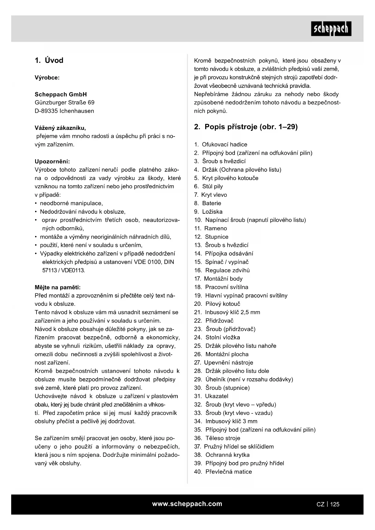 Výrobce: Scheppach GmbH Günzburger Straße 69 D-89335 Ichenhausen Vážený zákazníku, přejeme vám mnoho radosti a úspěchu při práci s no- vým zařízením. Upozornění: Výrobce tohoto zařízení neručí podle platného záko- na o odpovědnosti za vady výrobku za škody, které vzniknou na tomto zařízení nebo jeho prostřednictvím v případě: