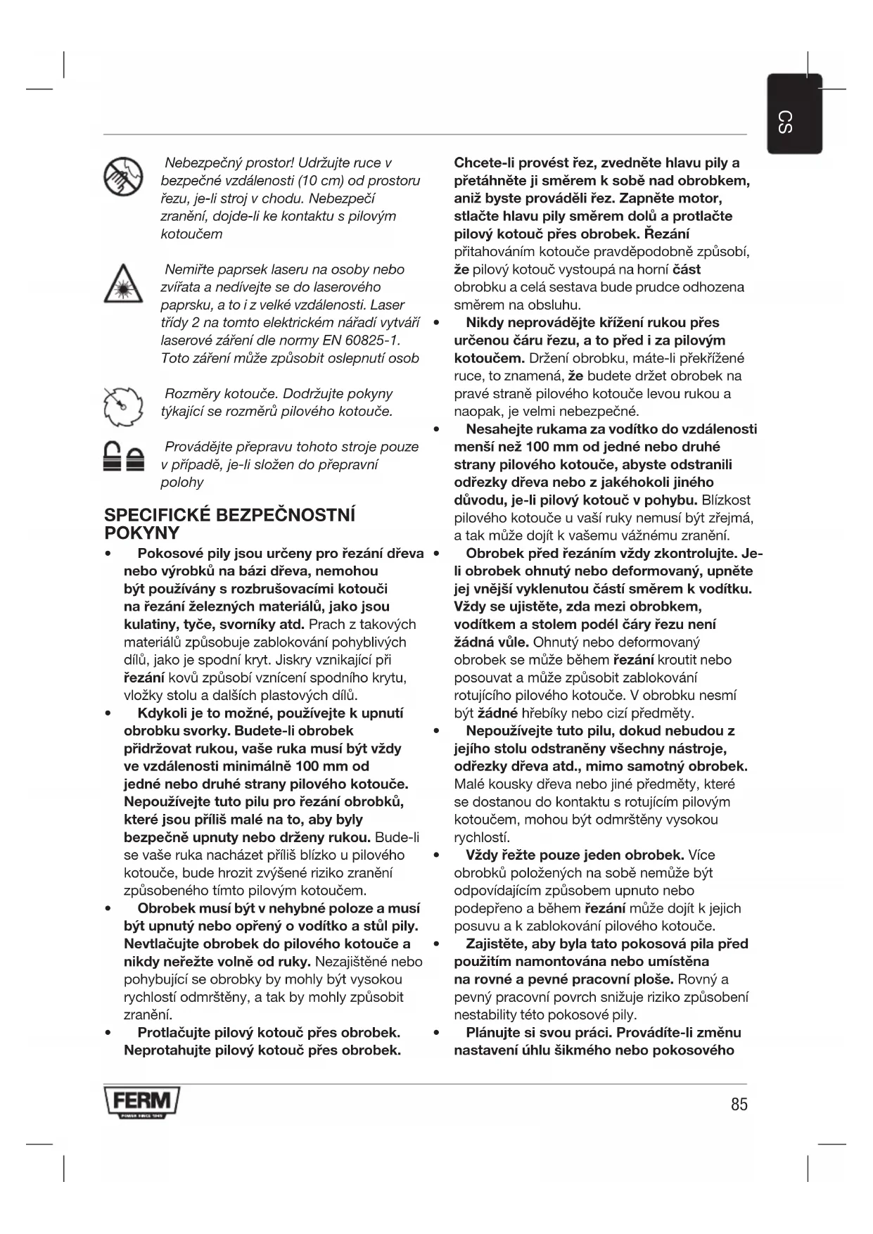 Prectete si priložené bezpecnostní výstrahy, dodatecné bezpecnostní výstrahy a bezpecnostní pokyny. Nebudete-li dodržovat tyto bezpecnostní výstrahy a pokyny, muže dojít k úrazu elektrickým proudem, k vzniku požáru nebo k zpusobení vážného zranení. Uschovejte tyto bezpecnostní výstrahy a pokyny pro budoucí použití. V této uživatelské prírucce a na produktu jsou použity následující symboly: Upozorňuje na riziko způsobení zranění, riziko ztráty života nebo poškození tohoto nářadí v případě nedodržení pokynů uvedených v tomto návodu Pozor, riziko úrazu elektrickým proudem Používejte ochranu zraku Používejte ochranu sluchu. Působení hluku může způsobit ztrátu sluchu. Používejte masku proti prachu Nebezpečný prostor! Nevkládejte ruce, prsty ani paže do tohoto prostoru.85